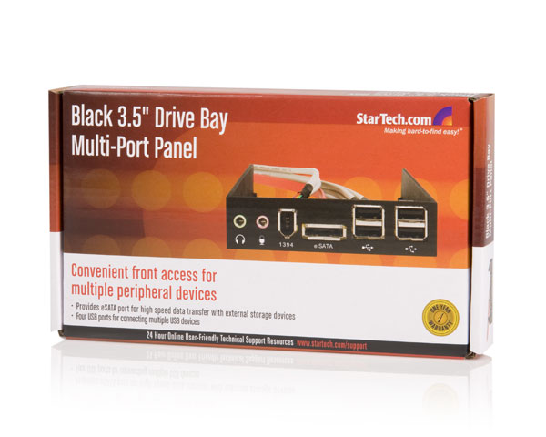 The panel can be installed into any 3.5in front panel drive bay to provide 4 USB 2.0 ports, an IEEE1394a FireWire port, Speaker and MIC ports, and an external SATA (eSATA) port for convenient quick connectivity to external storage devices.