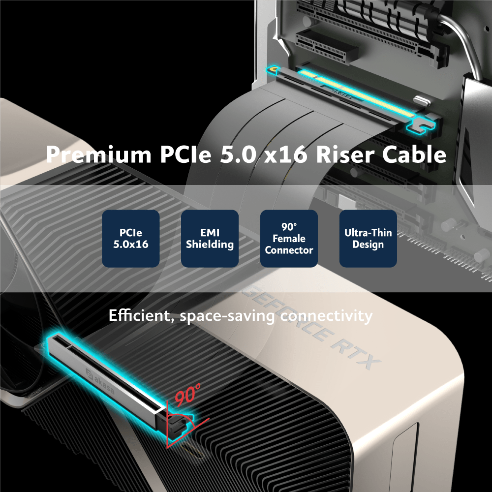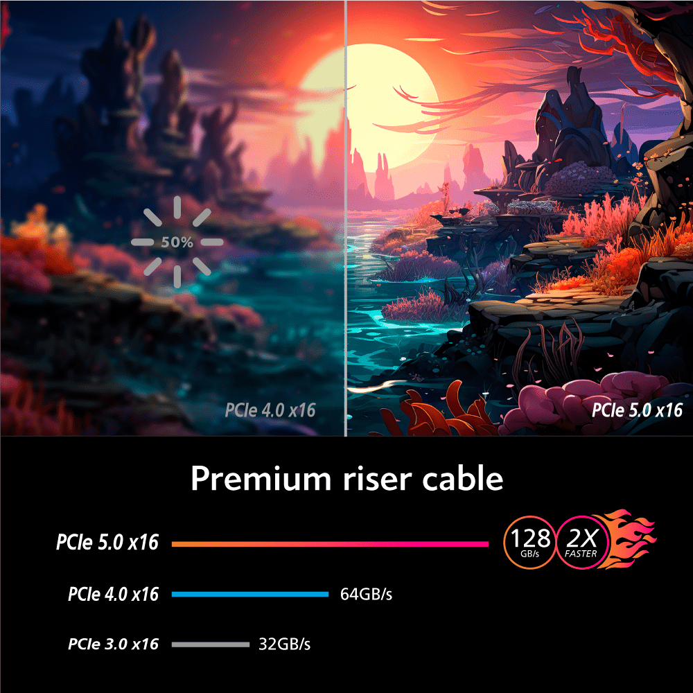 Premium riser cable supporting the ultra-high speeds of PCIe 5.0 x16, which delivers up to 128 GB/s, double the bandwidth of PCIe 4.0. Ideal for stable, high-performance gaming systems and professional workstations.