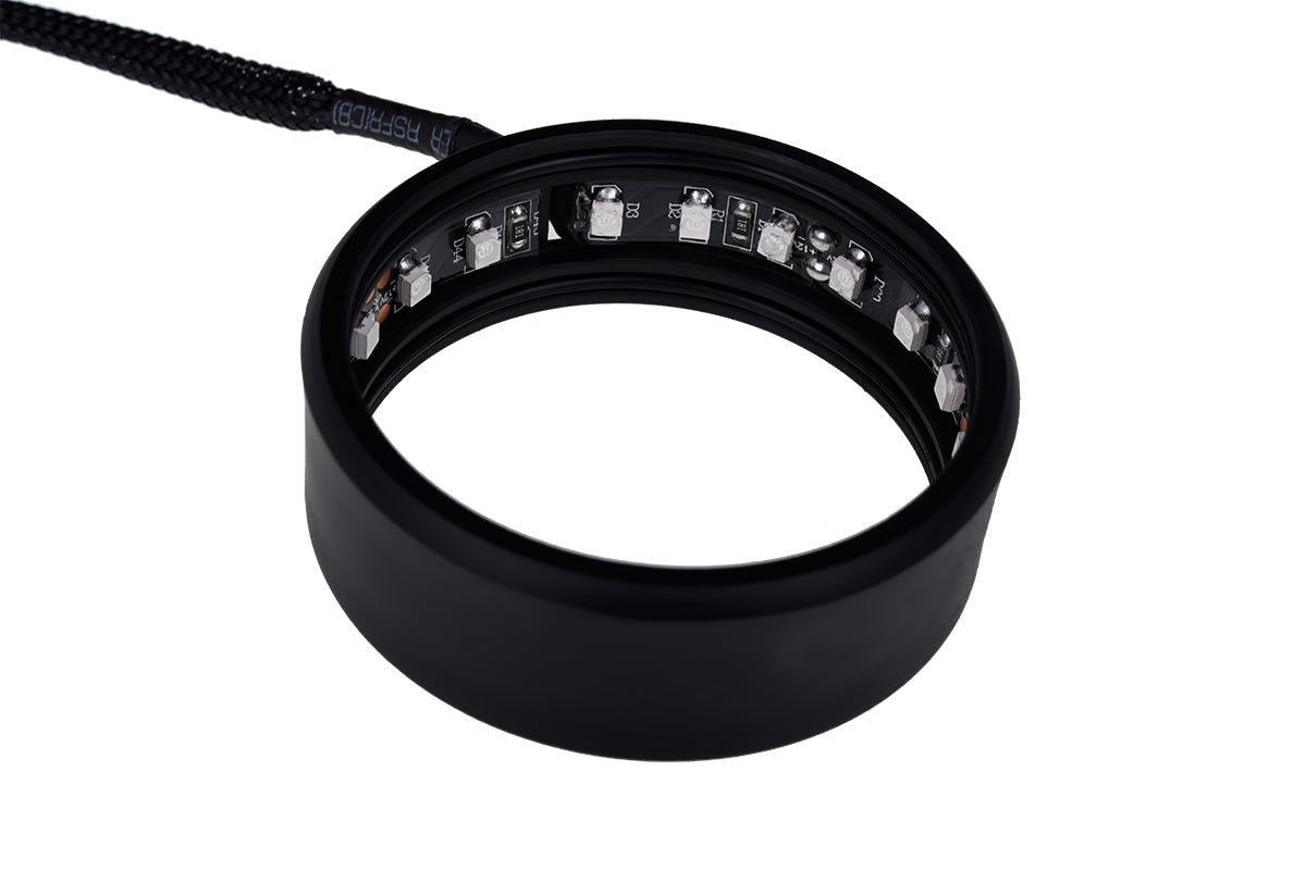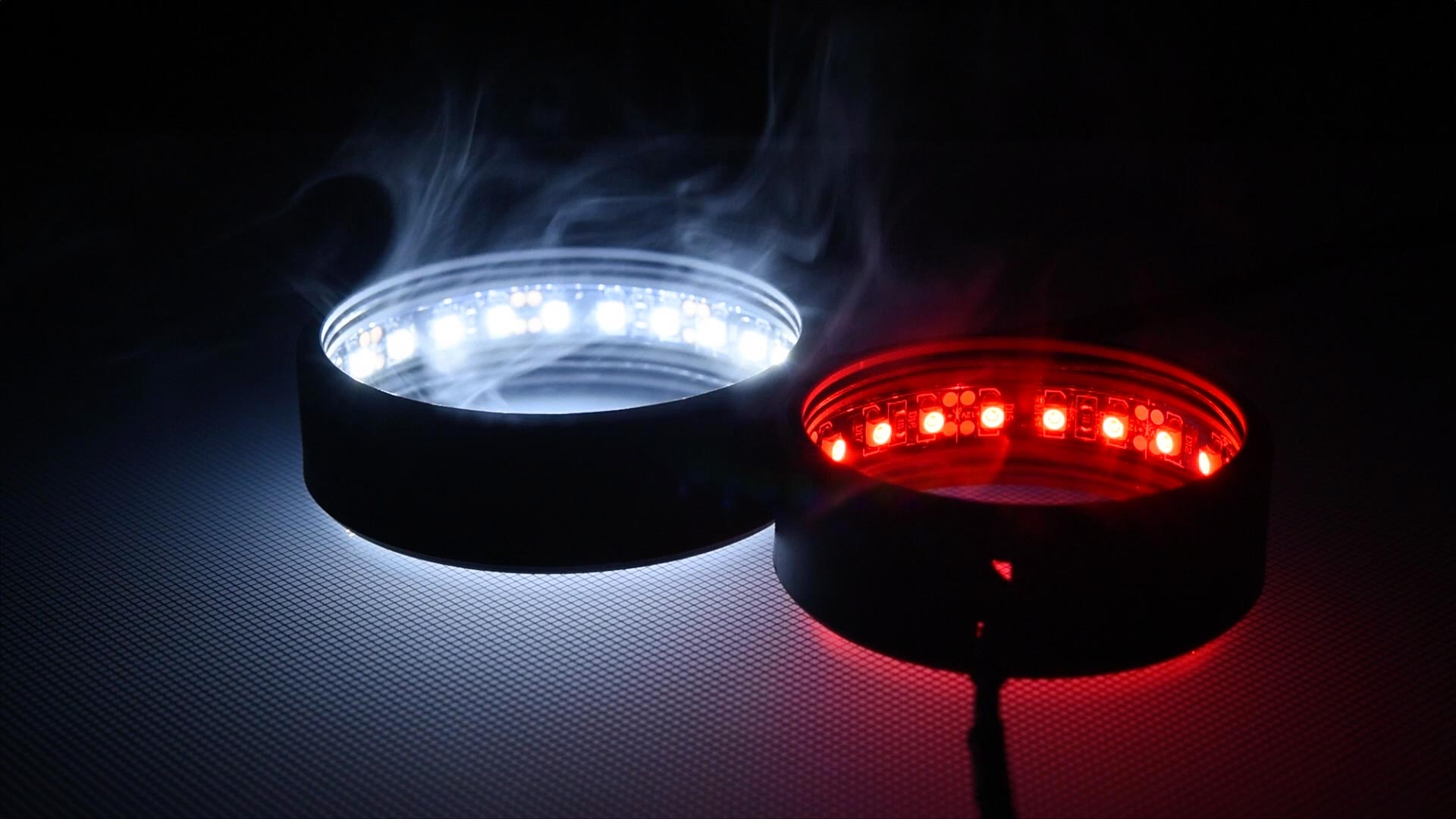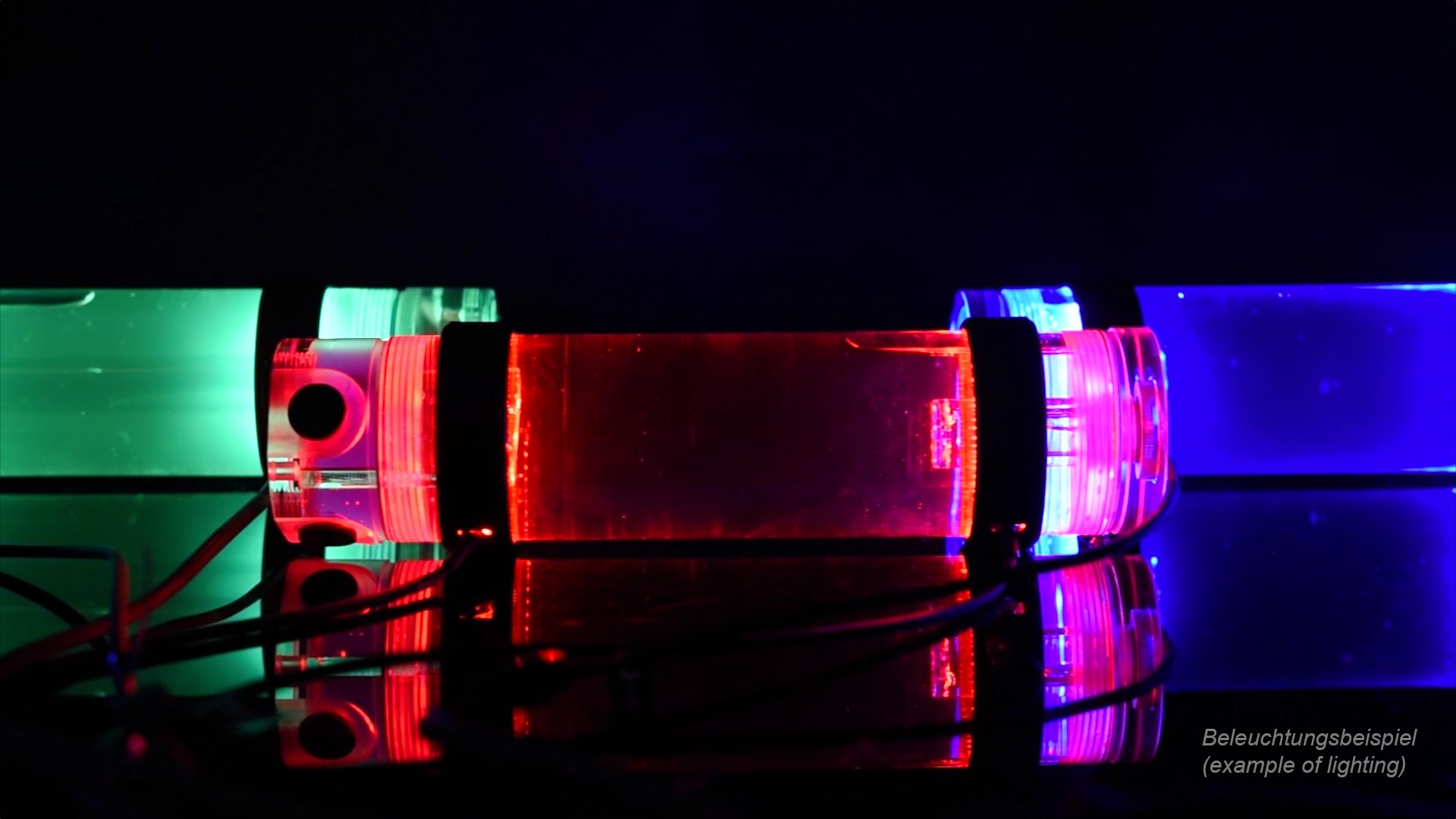 Two sizes are available, one for tube reservoirs with a diameter of 50 and one version for 60mm. The 50mm version is equipped with 18 LEDs, the 60mm with 24 LEDs. Due to the high number of LEDs, the illumination is normally much stronger than with the classic setup of single LEDs. Of course, you can also install two or more Auroras on one reservoir.