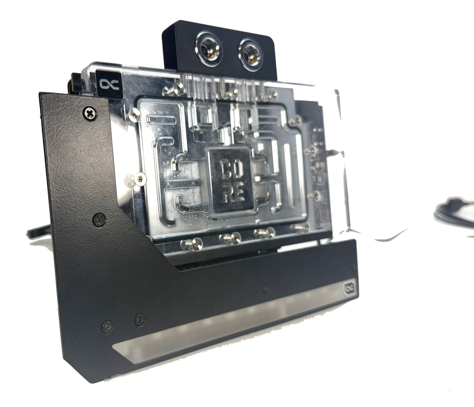 In the lower part of the bracket 11 digitally addressable 5V RGB LEDs are installed, which create a unique, very noble looking illumination. The Digital aRGB LED illumination is connected via a JST 3-pin connector. To control the digital RGB lighting, the included adapter must be plugged into the 3-pin female connector and connected to a digital RGB controller (e.g. Alphacool Aurora Eiscontrol, Art.15360, not included) or a digital RGB capable motherboard. The remaining 3-pin male connector can be used to connect additional digital RGB LEDs.