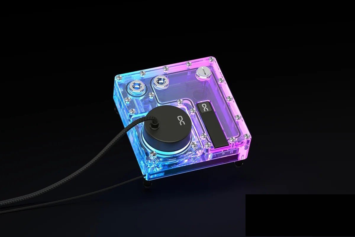 Alphacool's Core Reservoir is made of high-quality acrylic glass, allowing for an unobstructed view of the coolant and brilliant illumination by the built-in digital addressable aRGB LEDs. The lighting can be controlled via a digital aRGB header on the motherboard or optionally through Alphacool's Aurora Eiscontrol aRGB controller (item number: 15360).