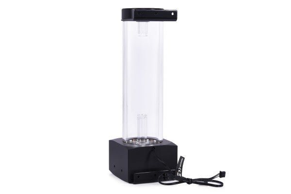 12 digitally addressable RGB LEDs illuminate the aycryl tube of the reservoir. They are mounted in a ring at the lower end of the tube in the transition to the pump top and provide brilliant illumination of the entire expansion tank. In combination with the Lighttower water effect, a very special ambience is achieved. The digital aRGB LED lighting is connected via a JST 3-pin connector and can be controlled with a digital RGB controller (e.g. Alphacool Aurora Eiscontrol, Art.15360) or a digital RGB capable mainboard.