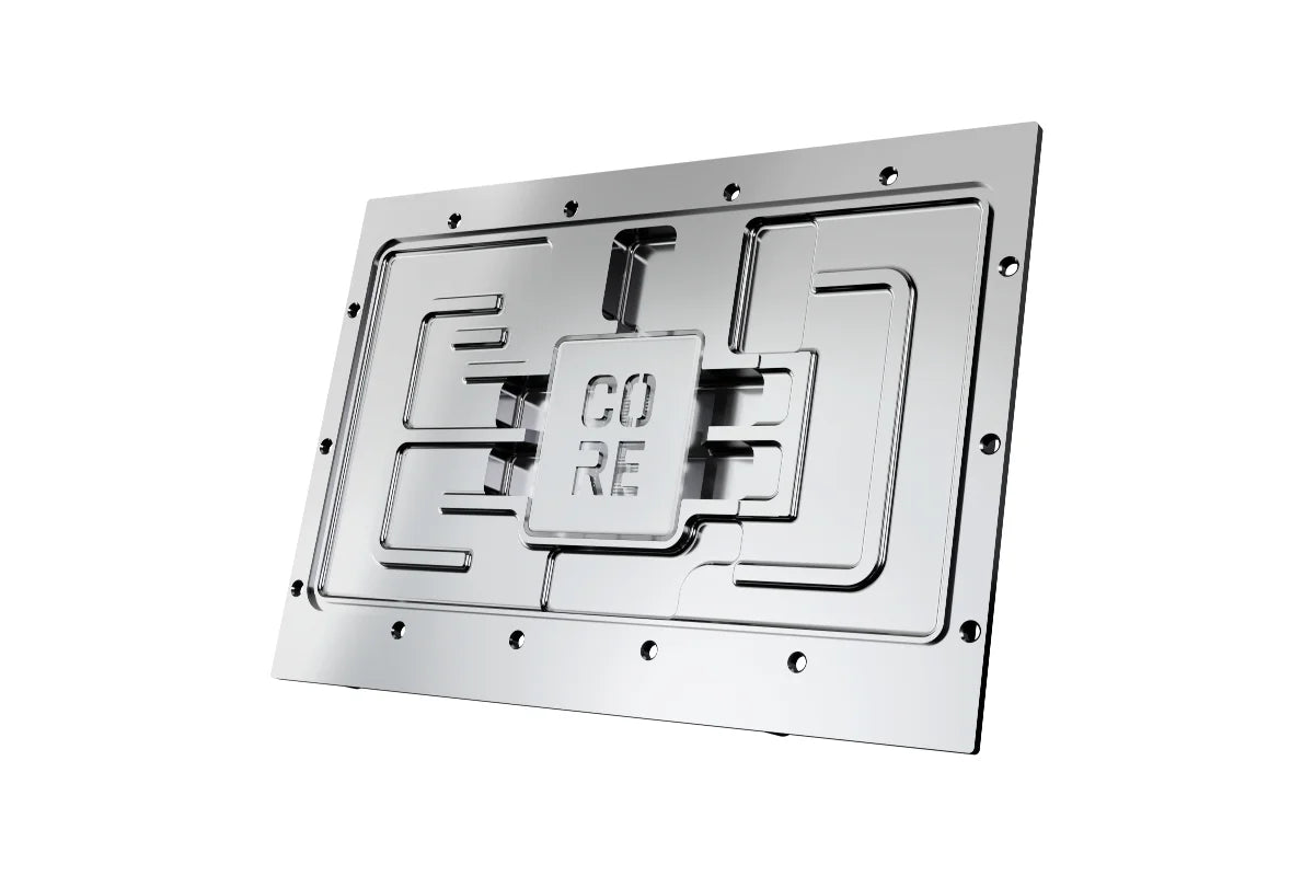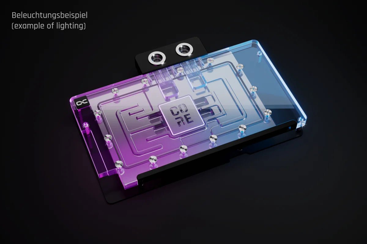 The visual design of the GPU water cooler has been slightly modified. A new highlight is the Core emblem placed above the jetplate, which emphasizes its affiliation with the Core series and visually enhances the design. The series continues to feature high-quality brass connectors that ensure optimal quality and safety. The specially adapted aluminum backplate covers the entire backside of the copper cooler, ensuring a clear and uniform appearance. The acrylic, combined with aRGB lighting, allows for even and impressive illumination of the entire cooler.