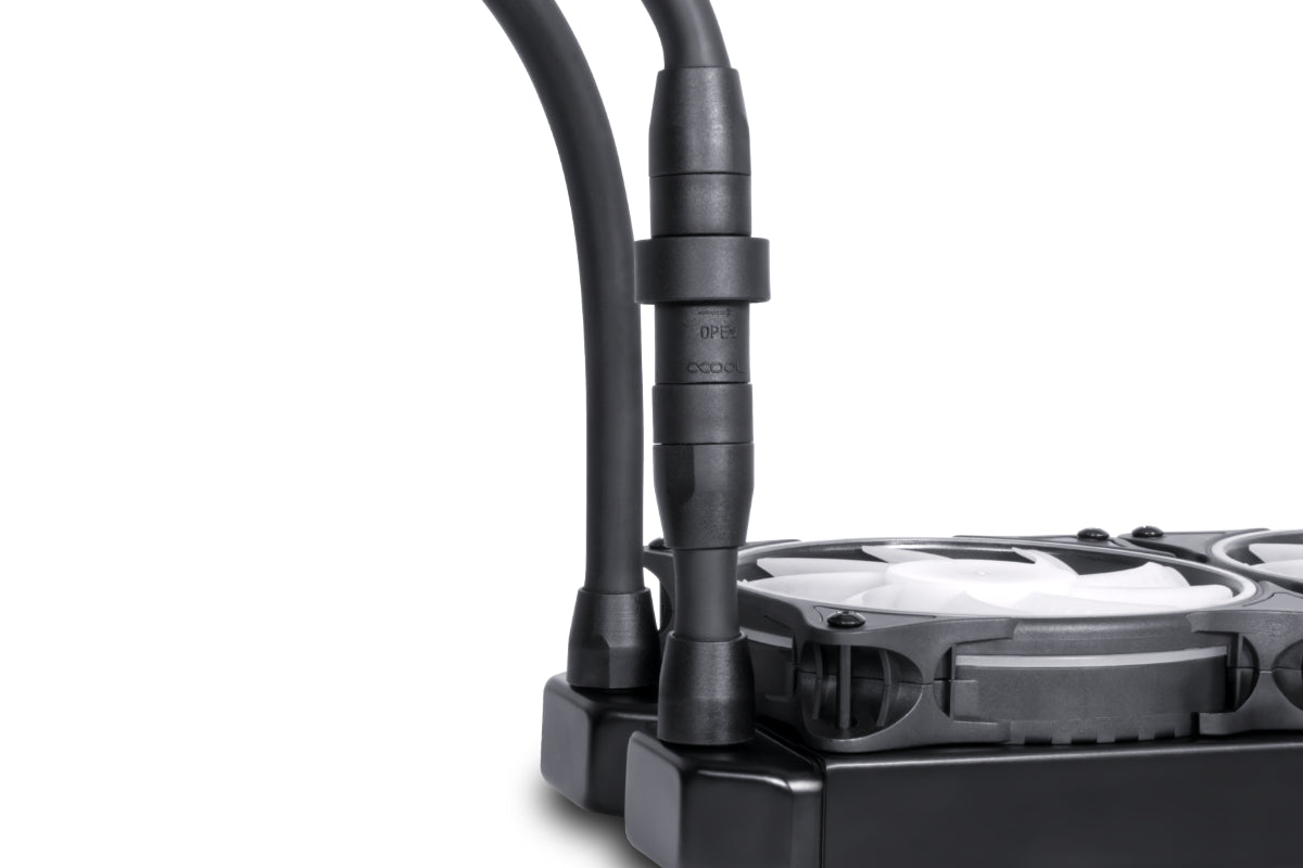 The Eisbaer Pro Aurora consists almost entirely of actual water cooling components. The extremely robust and durable TPV hoses are used in the enterprise products for servers and workstations. The hose connections also come from the Enterprise series from Alphacool and use the standard G1/4. This makes the Eisbaer Pro Aurora fully compatible with all common water cooling products. The quick-release fastener allows easy expansion of the AIO with additional components. The most important of these are the prefilled radiators and the Eiswolf GPU AIO water cooling system.