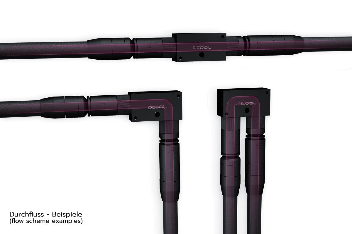 The ES Distro Plate C1 has a total of 4 G1/4 connections with 5mm deep threads. There are 2 connections at the front and one connection thread at each front side. Please refer to the enclosed instructions to connect the components correctly. Due to the various configuration options, all components in the loop can be connected to the Distro Plate very easily. Of course, several ES Distro Plates can be connected in series.