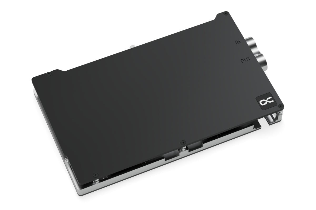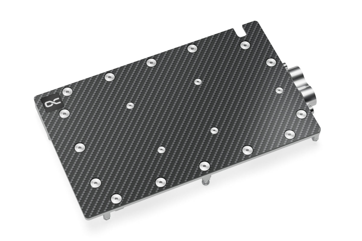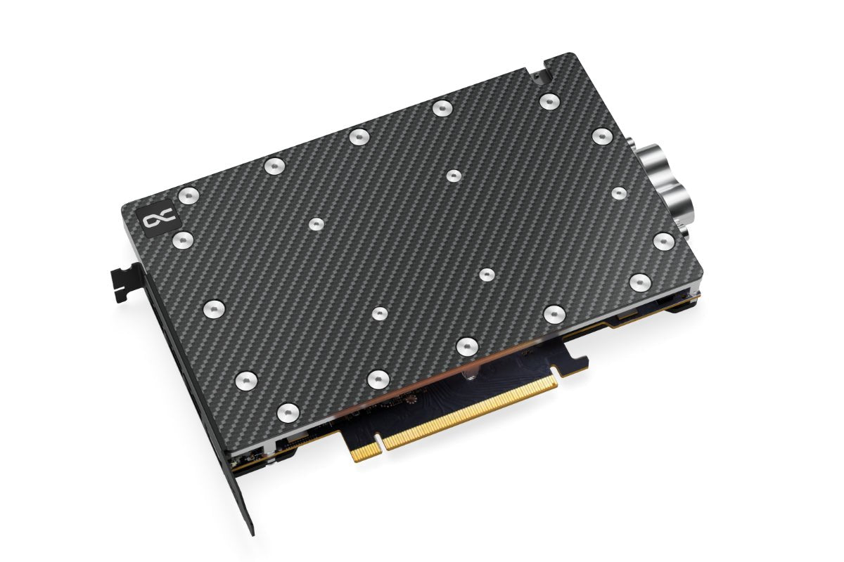 The Alphacool ES GPX Copper/Carbon water cooler with backplate was developed for the Alphacool Enterprise Series. Due to the positioning of the connections, the hosing of the cooler in the server rack is significantly simplified. The top of the cooler is made of carbon. This makes the water cooler lighter compared to Alphacool's Eisblocks with acetal or acrylic tops. Thanks to the compact design, only 1 slot is needed to mount the cooler in the server rack instead of 1.5 slots as before. This additional space saving is one more argument for using the ES GPX Copper/Carbon graphics card water cooler.