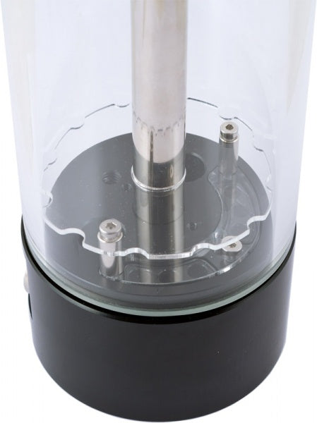 All reservoirs of the aqualis series are equipped with a borosilicate glass tube. In contrast to acrylic glass, which is often used for tube reservoirs, borosilicate glass is extremele hard and scratch-resistant, features superb thermal and chemical resistance and a very low thermal expansion. The glass tube of the 450 ml and 880 ml variants has an outer diameter of 75 mm and a wall thickness of 5 mm. Base and top of the aqualis reservoirs are made from Delrin and connected by a stainless steel tube. As a optical highlight, a fountain effect can be realized. If the return line is connected to the center connector of the reservoir, the water flows through the stainless steel tube to the top of the reservoir, where it is ejected through eight nozzles. In combination with illumination, this is a real eye catcher effect. A thin acrylic plate near to the bottom of the reservoir reduces air ingestion to a minimum. Alternatively, the return line can be connected to a lateral connector of the reservoir, the water then exits directly from the base part. For this configuration, a deflector plate is included in delivery to ensure can be installed to effectively remove air from the water circuit.