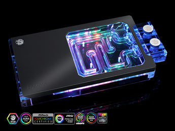 The full-cover water block is precisely machined from nickel- and chromium-plated copper, ensuring maximum contact with the GPU and VRM for superior heat dissipation. The clear acrylic top showcases a built-in Bitspower Digital RGB LED strip, adding brilliant illumination to your loop.