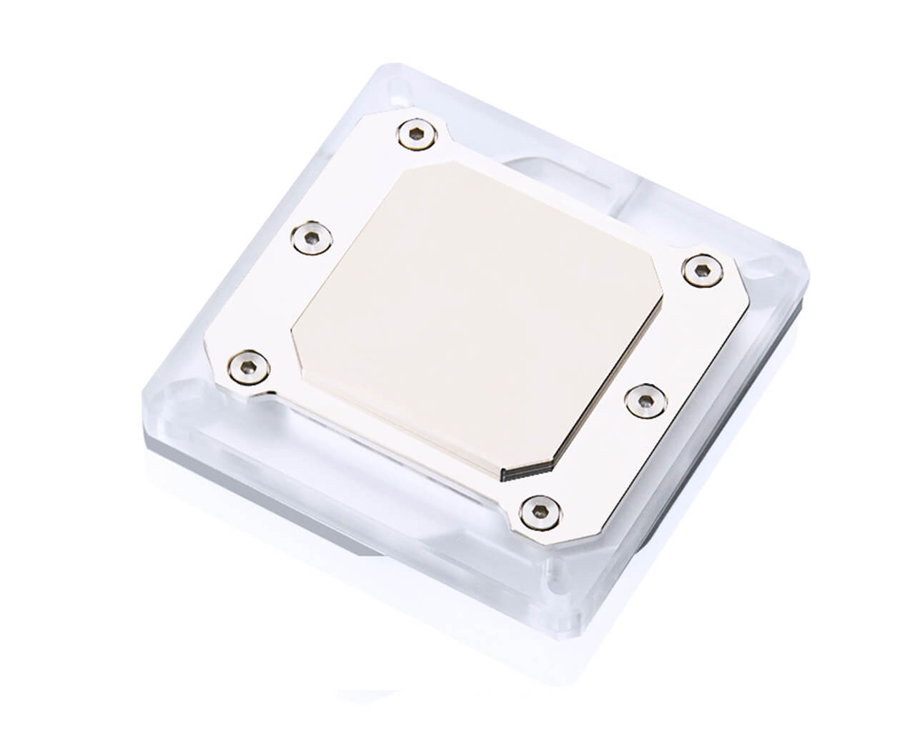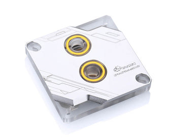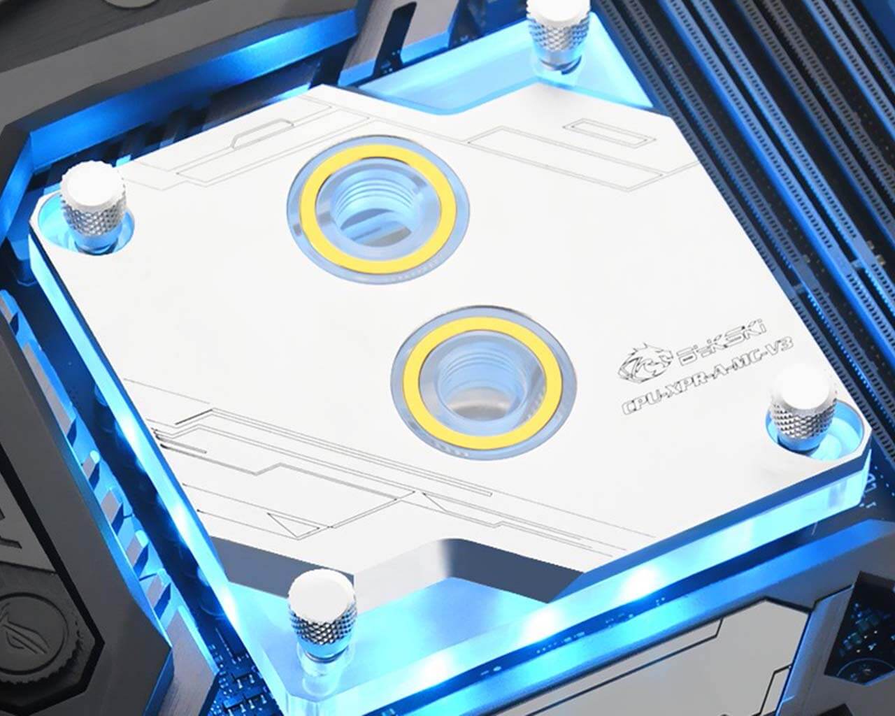 The Bykski CPU-XPR-A-MC CPU Water Cooling Block features an aluminum top plate that covers the precision machined PMMA top. The PMMA on the sides and around the ports allow the colors to flow through when the included RBW lights are engaged.