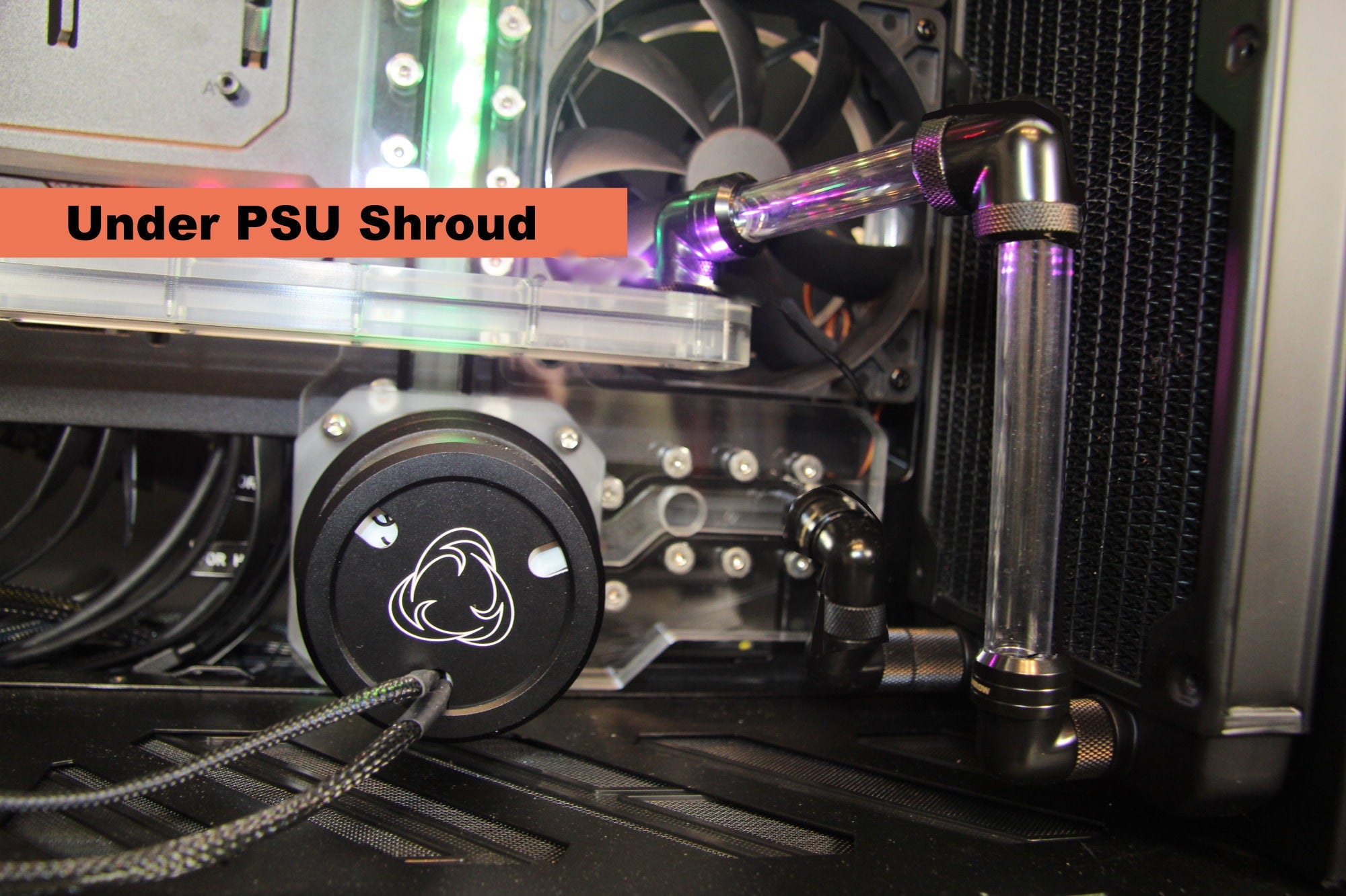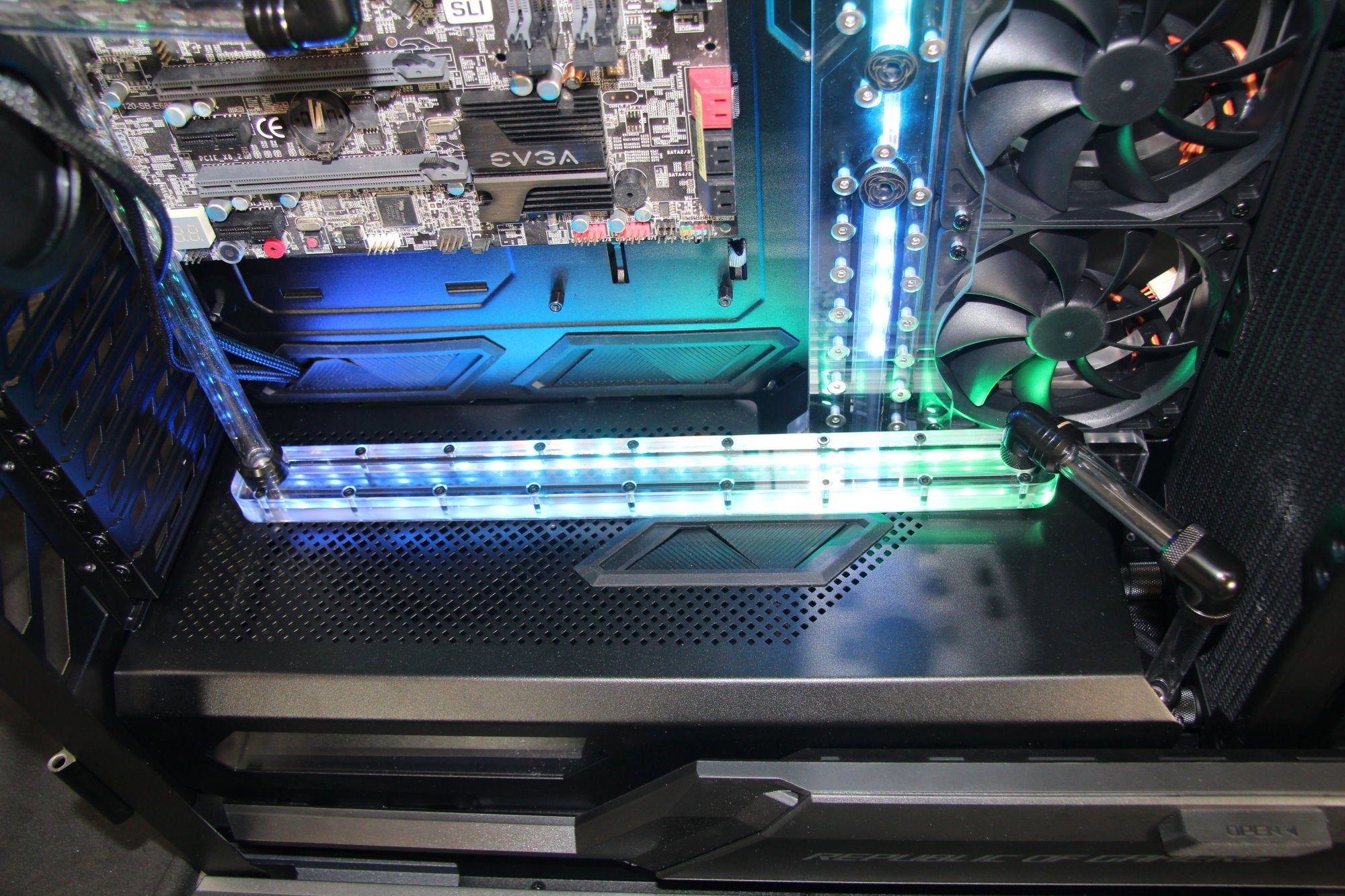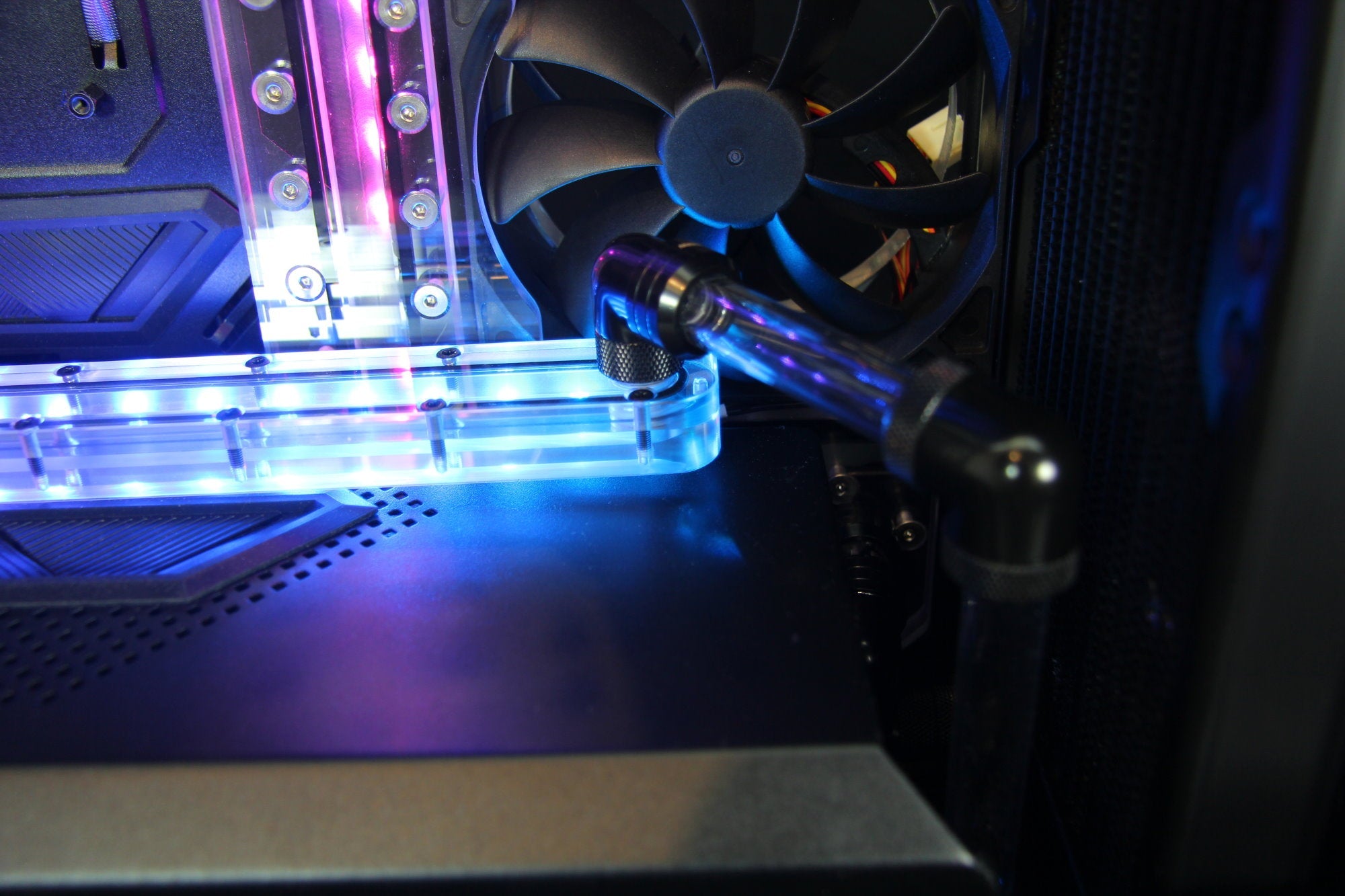 This distroplate pump res combo set is specifically designed to fit into the ASUS ROG Hyperion GR701case on the side next to the motherboard (center), and the back inside panel. Featuring 14 Ports total, designed to be used with 2 x 420mm radiators! Distroplates include integrated D-RGB strips for stunning lighting effects. This distro plate is compatible with standard D5 or DDC pumps. This distroplate set was design with a new compact D5 pump mount due to the marrow space used in the chassis for mounting. We carefully designed the center distroplate to have scalloped sides so that none of the center 120mm fan mounts are interfered with so that you can maximize your chassis airflow! Not included but seen in some of the images is a Stealkey Customs CubeTube 360mm. This is perfect for mount on top of the PSU shroud to return the loop from the front to the back. Visually its more interesting and attractive to look at vs. just another lateral tube. You can add this as an option below. Included with the 2 distroplate set is the spacer mount that goes between the 3 center 120mm fans and the actual distroplate. Enjoy this beautiful Channelz™ set and optimize the ROG GR701's cooling today!