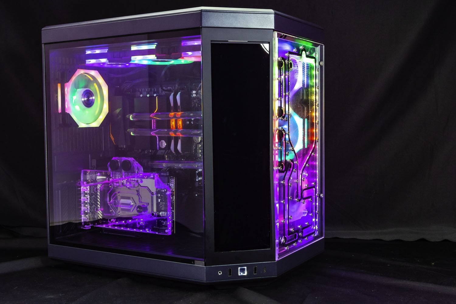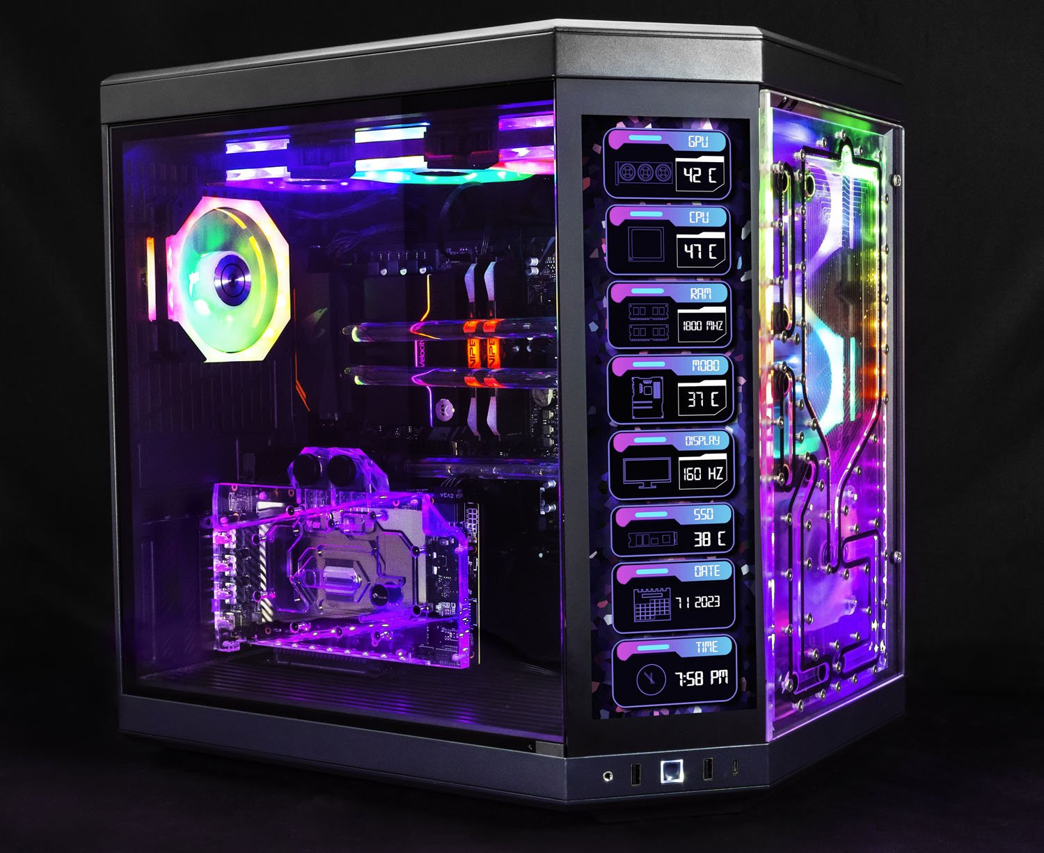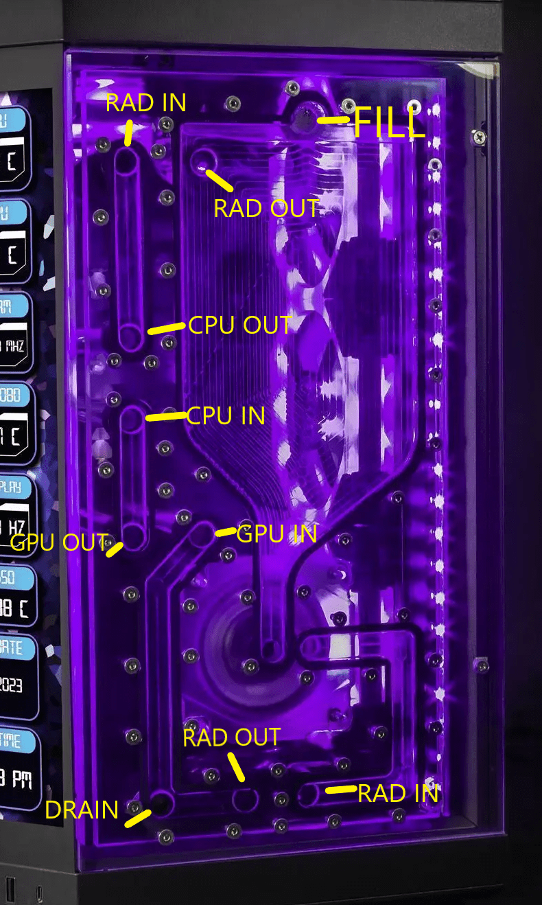 This distroplate pump res combo is specifically designed to fit into the Hyte Y70 case Replacing the front glass. Featuring 10 Ports total, designed to be used with 2 radiators and integrated D-RGB for stunning lighting effects. This distro plate is also compatible with standard D5 or DDC pumps. This distroplate was carefully designed to allow for completely straight hard tubes for that perfect aesthetic look!