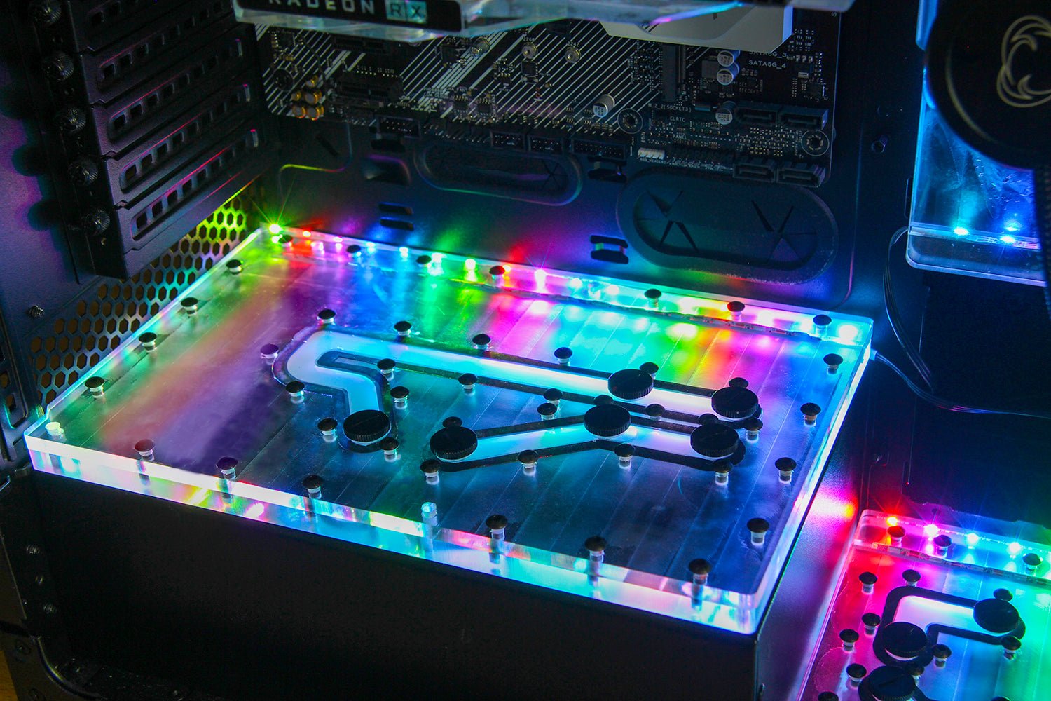 This distroplate pump res combo is specifically designed to fit into the Corsair 1000D case. Designed to work with Channelz Corsair 1000D Series Distro's, it has integrated D-RGB for stunning lighting effects.