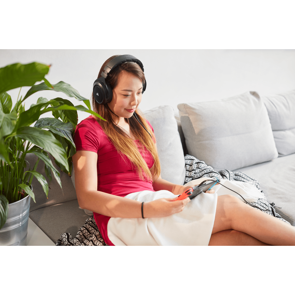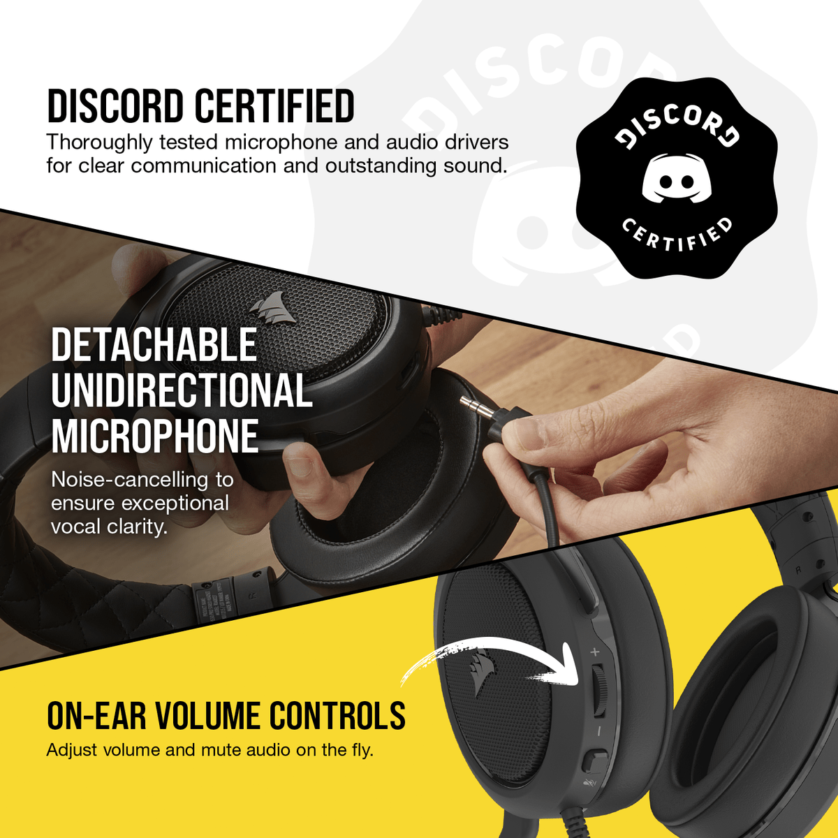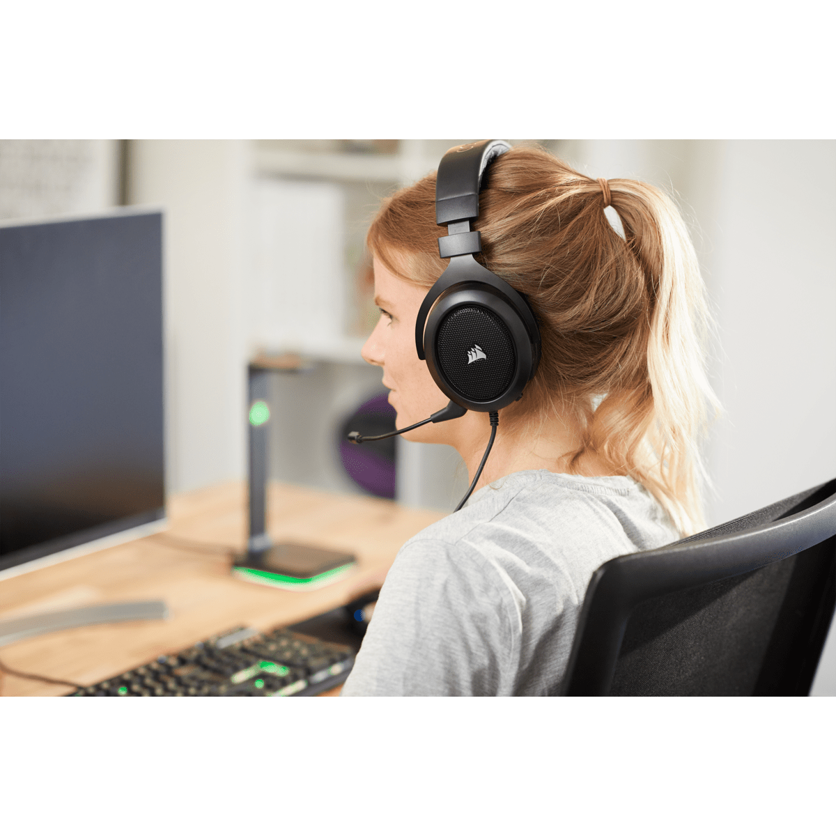 The CORSAIR HS50 PRO STEREO Gaming Headset delivers both comfort and quality with memory foam ear pads, custom-tuned 50mm neodymium audio drivers, and a detachable noise-cancelling unidirectional microphone.