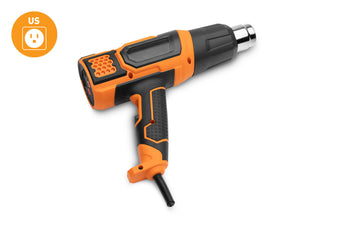 The heat guns case is made out of durable and lightweight plastic with rubber inserts for a comfortable grip. The back of the heat gun and handle are flattened to allow for vertical positioning of the air nozzle. The powerful heater core and fan can quickly deliver up to 500 l/min (18 CFM) of 60-600°C air. It features two power and airflow settings. The first setting with a gentler temperature curve and airflow, topping out at 350°C, and the second with maximum airflow and 600°C air temperature.