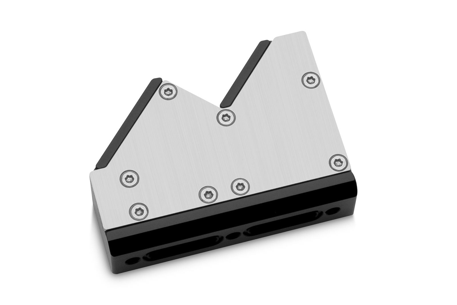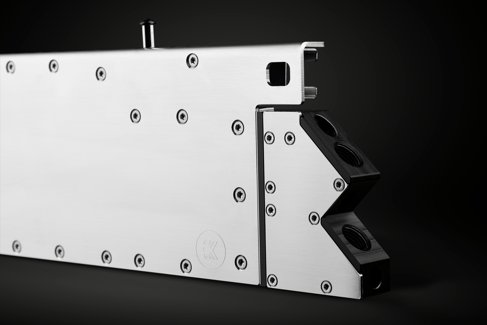 The base of the block is CNC machined out of nickel-plated electrolytic copper, while the top is laser-cut out of industry-grade stainless steel. The top plate possesses a screw-in PCIe power connector bracket to securely hold the power connector once fully assembled. High-quality EPDM O-Rings ensure the sealing, and the brass standoffs are pre-installed to enable a safe and easy installation procedure.