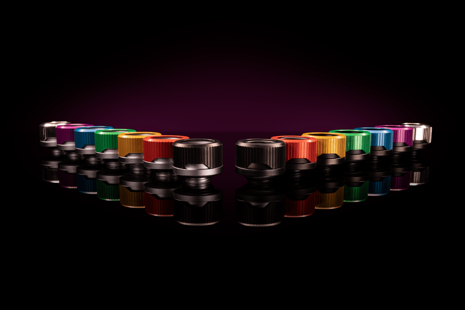 The locking ring is compressing the tubing wall underneath the ring, and this prevents the flexible tube from being pulled off the barb of the fitting. The grooves on the outside allow for easier hand tightening. The compression ring has cutouts in the EK Quantum signature shape allowing for the colored aesthetic ring to be shown. The colored rings are available in many colors and are screwed onto the fitting before the compression locking ring. The aesthetic rings are sold separately.