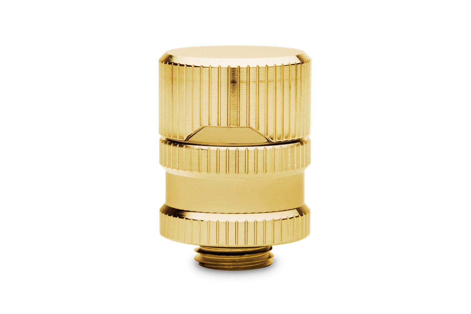 EK-Quantum Torque Drain Valve - Gold is a premium fitting acting as a perfect draining point in your system. It features a secure cap, in form of a Torque fitting compression ring, and it can even fit an aesthetic color ring for HDC 16 Torque fittings. The secure cap does not allow you to accidentally open or leave open the drain valve.