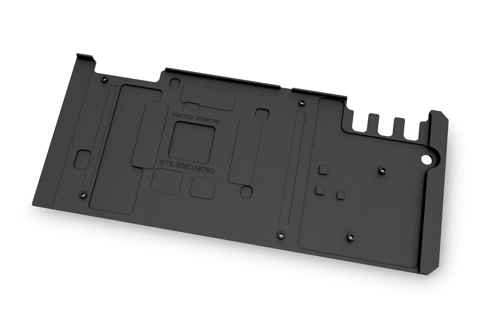 EK-Quantum Vector Xtreme RTX 3080/3090 Backplate - Black is a CNC machined retention backplate made from black anodized aluminum, that fits all EK-Quantum Vector Xtreme RTX 3080/3090 water blocks.