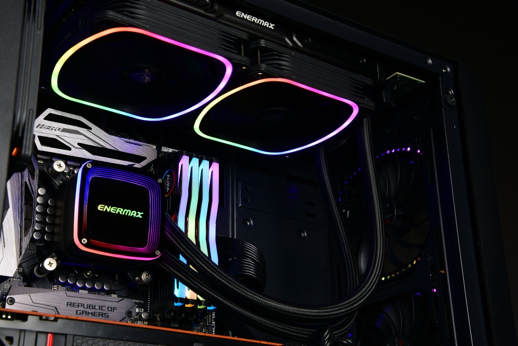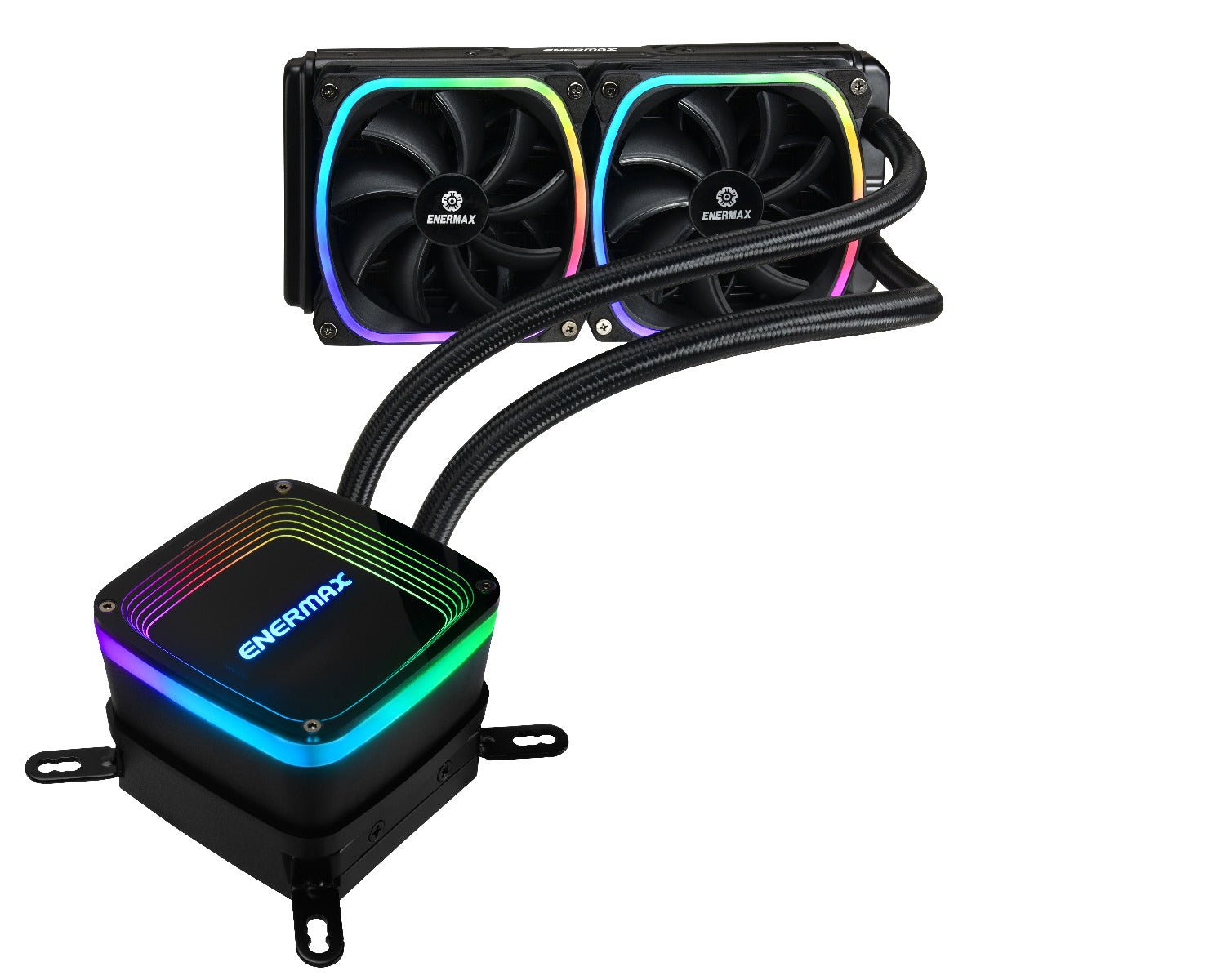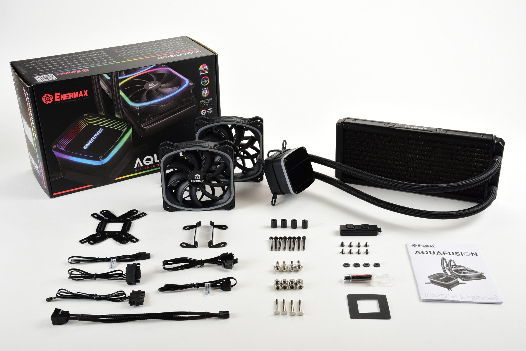 A closed-loop liquid cooling solution that supports a wide range of Intel and AMD platforms. It creates amazing rainbow RGB lighting on its acrylic covered water block and similarly-square LED ring on the radiator fans, offering you the ability to create a visually-stunning rig that wows everyone. Cooling-wise, this liquid cooler features Enermax acclaimed technologies like vortex frame design for the fan and exclusive Shunt-Channel Technology (SCT) to quickly and efficiently take heat awayâ??keeping your system running always cool and stable even under pressure. You can control and customize the lighting via two ways: using the included control box, or through motherboard solutions including Asus Auro Sync, Gigabyte RGB Fusion, MSI Mystic Light, etc. AQUAFUSION is one-of-a-kind cooling solution for custom gaming rigs or stunning system builds.