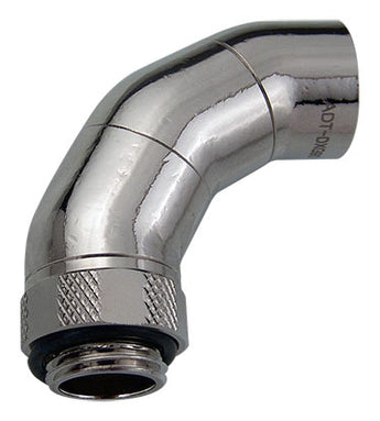 Koolance swiveling G 1/4 BSP socket fitting. Each segment rotates for a maximum 90-degree bend. Made of brass with nickel plating.