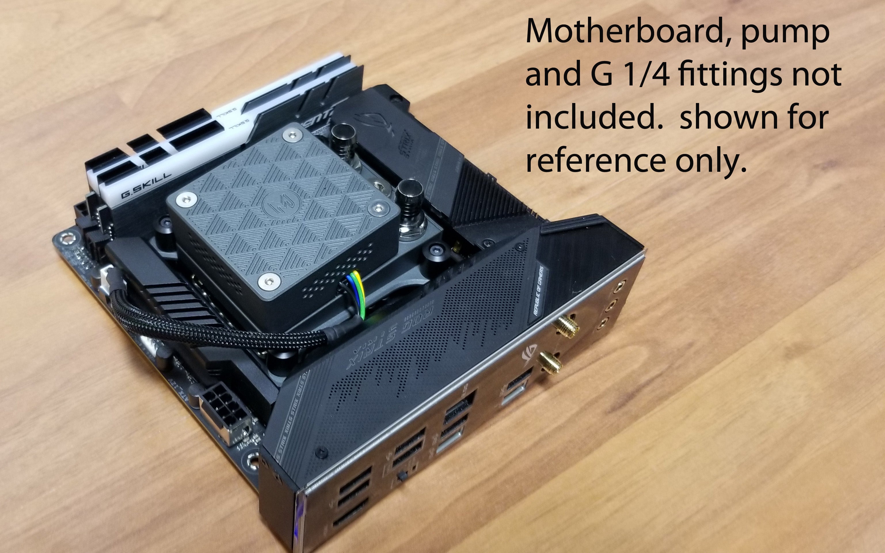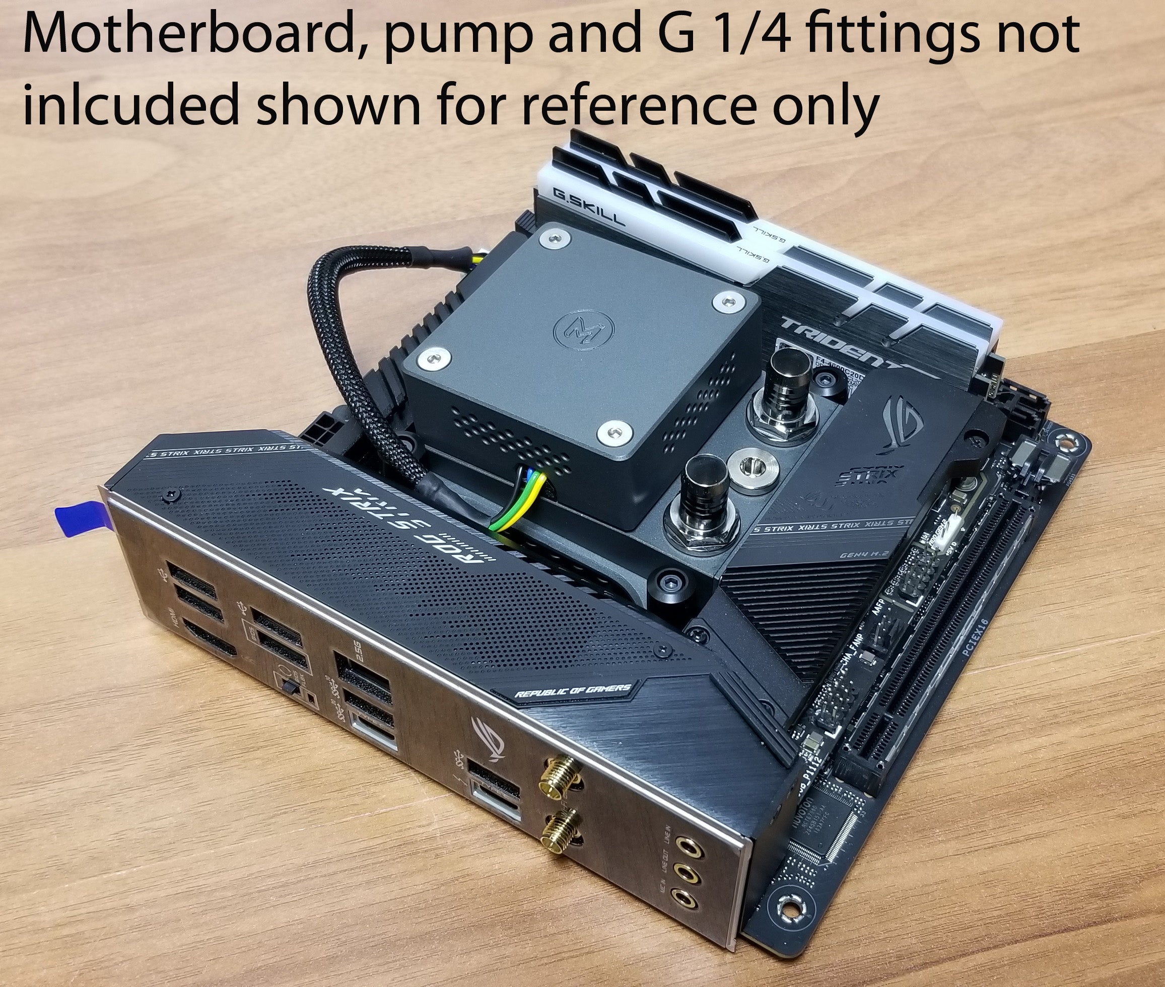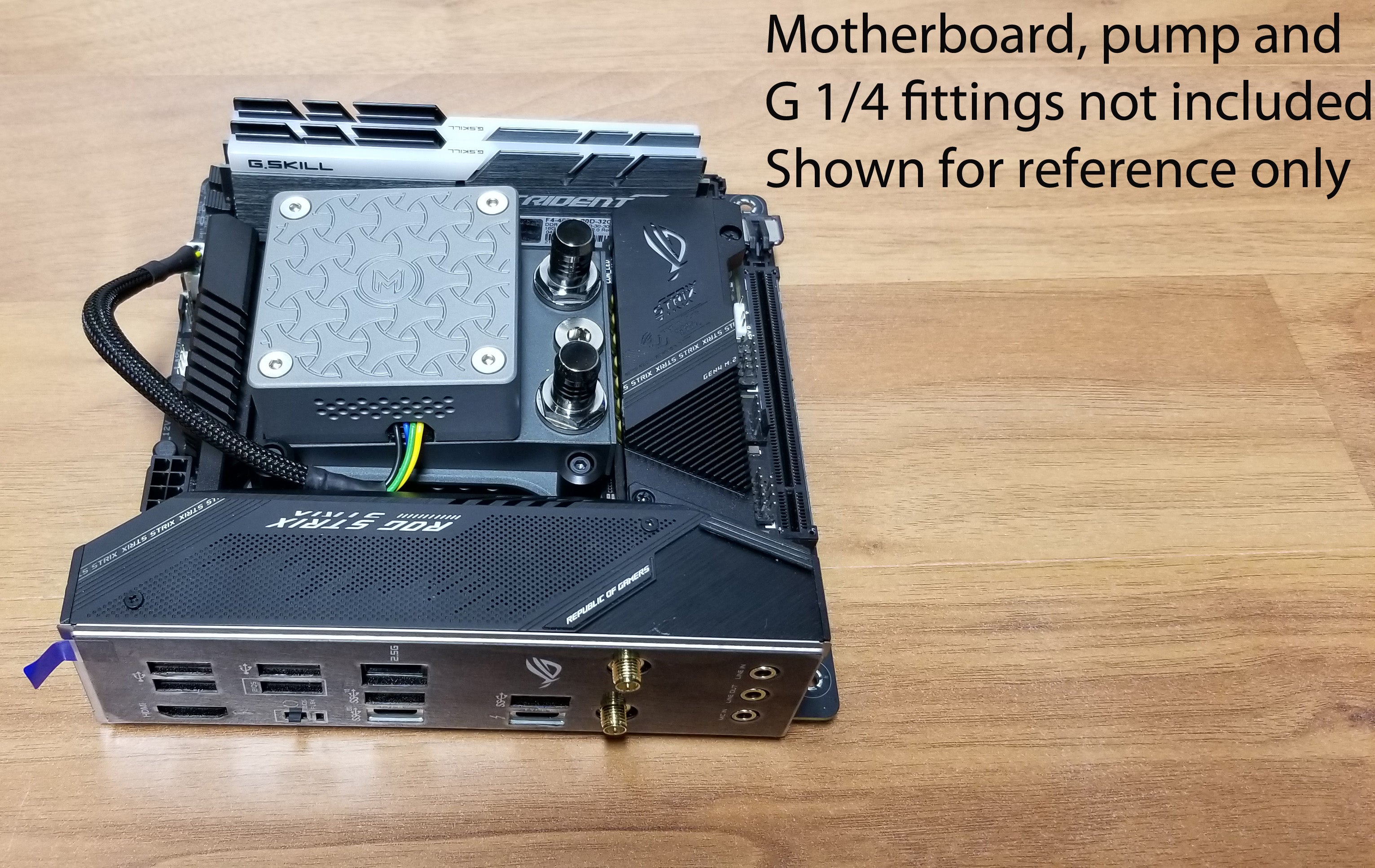 The LOBO uses 2x G ¼ ports for in and out flow. There is also one G1/8 fill port that can be used with an extension hose to fill the loop.  A G1/8 plug is included with purchase.  No other fittings are included.