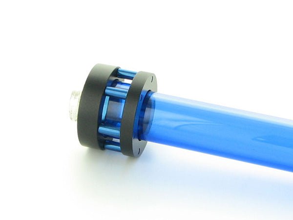 The Chain Gun design aesthetic is aimed squarely at builders looking for a compression fitting that makes a bold, in your face, take no prisoners, statement. The thematic design, with double gun metal black machined brass mounting rings holding six accent colored barrels, is a homage to excessive firepower. Think Predator or BFG and you're getting the picture.