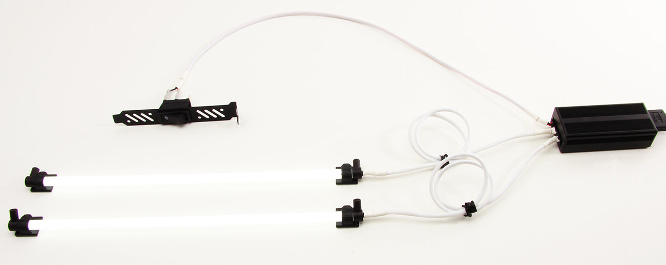 For those that know how to sleeve and have the tools to do this we applaud you! For the many out there that do not have the skills, the tools or the time and want the finest cathode kit they can put in their case...this one is for you! These kits are professionally sleeved in house and take over one hour of labor to complete. So this is not a quick cheap product. We meticulously sleeve the inverter cable harness and both bulbs and complete the kit with your choice of 2-port or 4-port Monsoon CCFL Inverter and then a ModMyToys Premium Vented Black PCI Bracket with LED Rocker Switch to match your cathode color. It all flows and you can be assured it has that professional look to wow your friends and family! Your PSU cables are single braided so why forget your cathode kits? Light up your world in style!