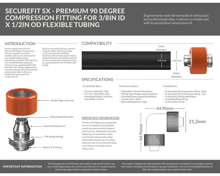 Introducing the SecureFit SX Premium 90 Degree Compression Fitting Set, designed to provide a seamless and secure connection for your liquid cooling systems. Specifically crafted for 3/8-inch ID by 1/2-inch OD flexible tubing, this fitting set ensures a guaranteed fit with PrimoFlex LRT tubing. Engineered to meet the demands of enthusiasts and professionals alike, it delivers a reliable seal and exceptional compression fit. Rest easy knowing that your system's integrity will be maintained under various operational conditions. Experience the ultimate peace of mind and performance with the SecureFit SX Premium Compression Fitting, backed by a guaranteed fit with PrimoFlex LRT tubing.