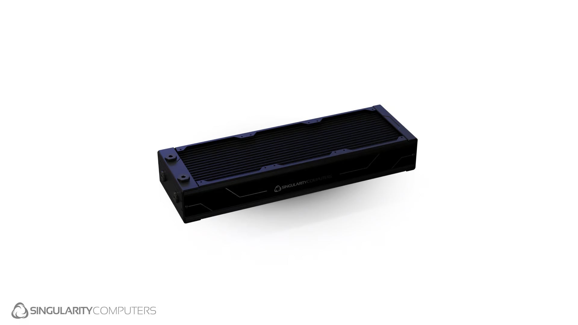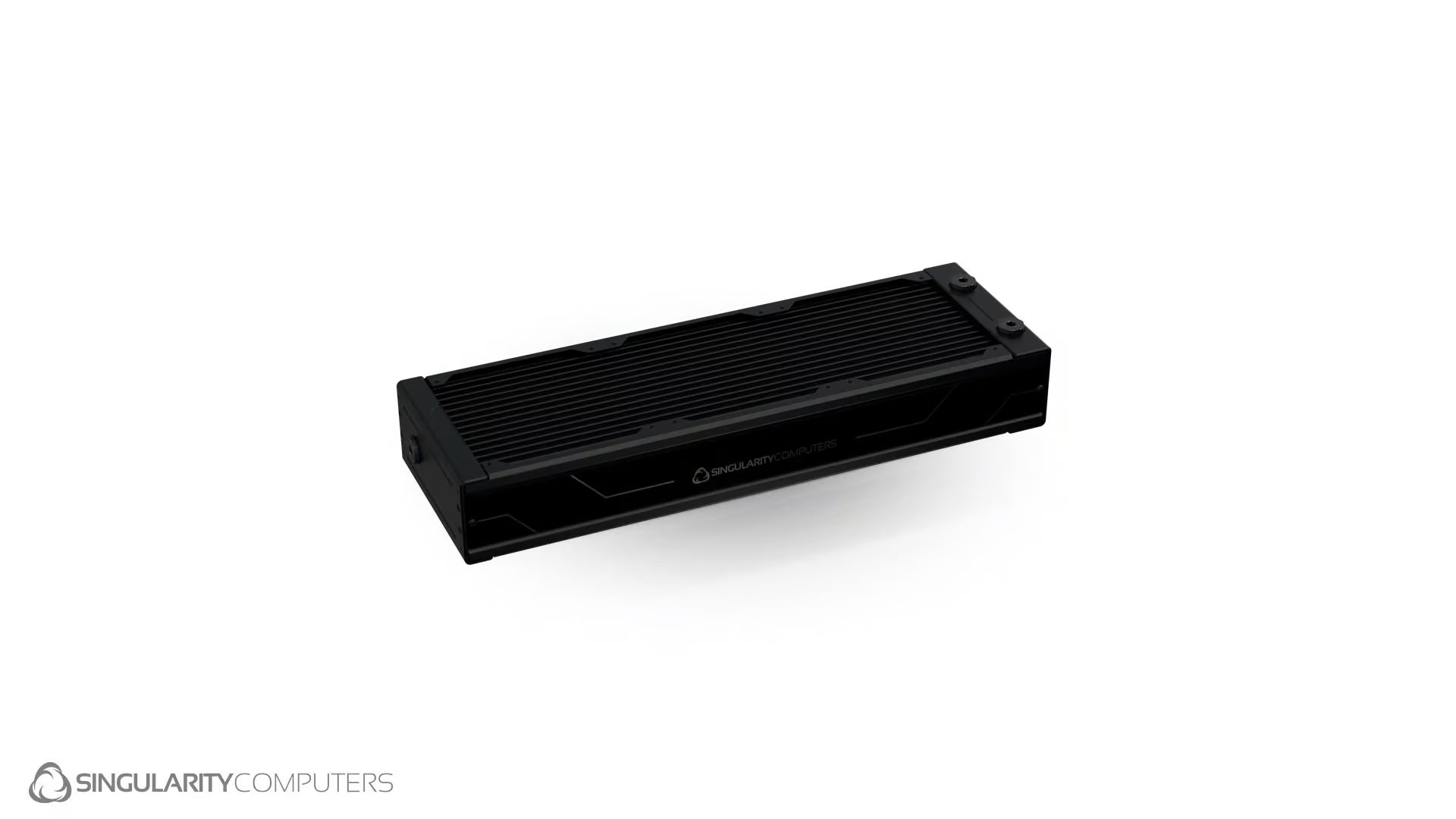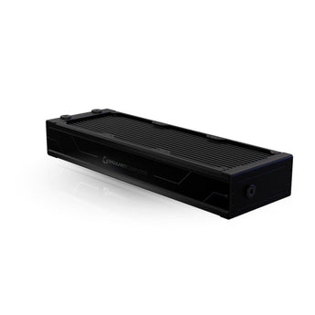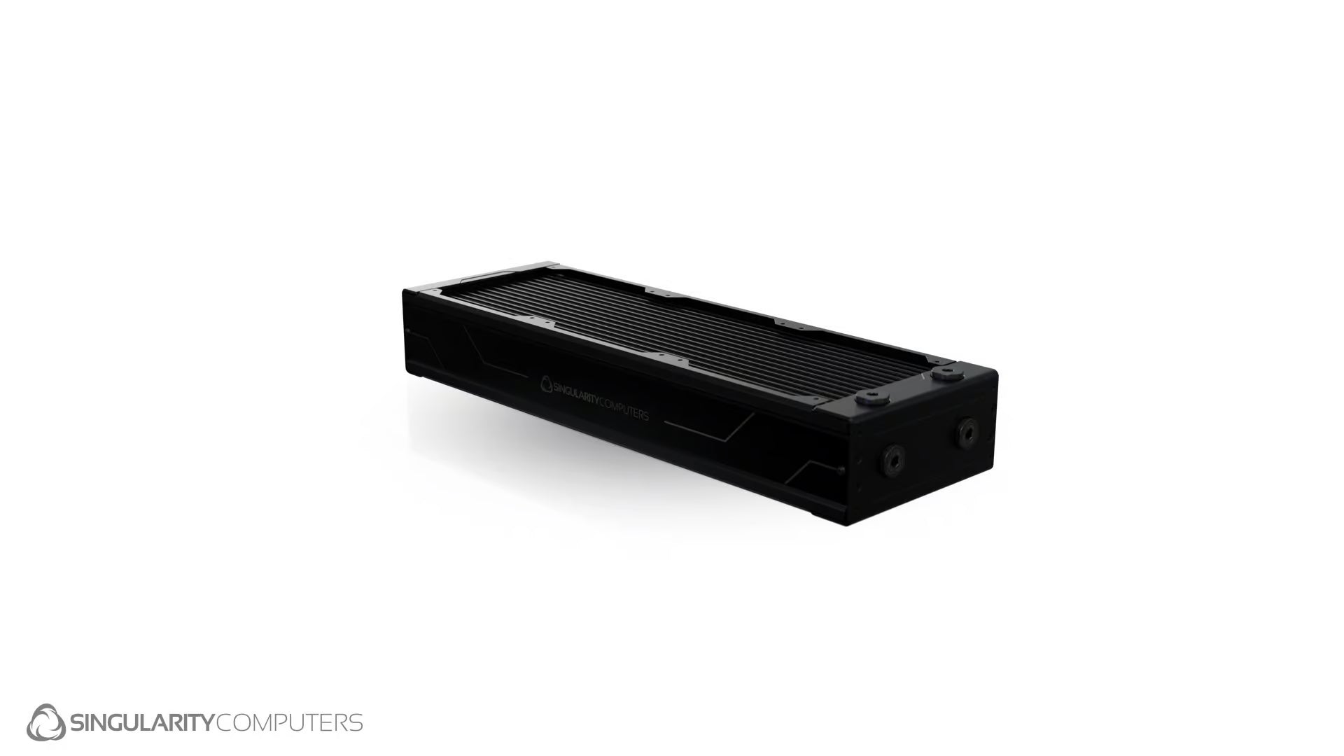High performance, premium quality radiator with a full copper core. With 16 fins per inch the fin array is designed for low to medium RPM fans (800-1800rpm). Designed for maximum performance and low noise output with subtle industrial aesthetics. Satin Black powder coated finish. PCB covers on the sides with silver Singularity Computers Logos; these covers are removable. Multi-port design with two ports on one side, 2 ports on the end, and 1 port on the opposite end for 5 ports in total.