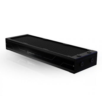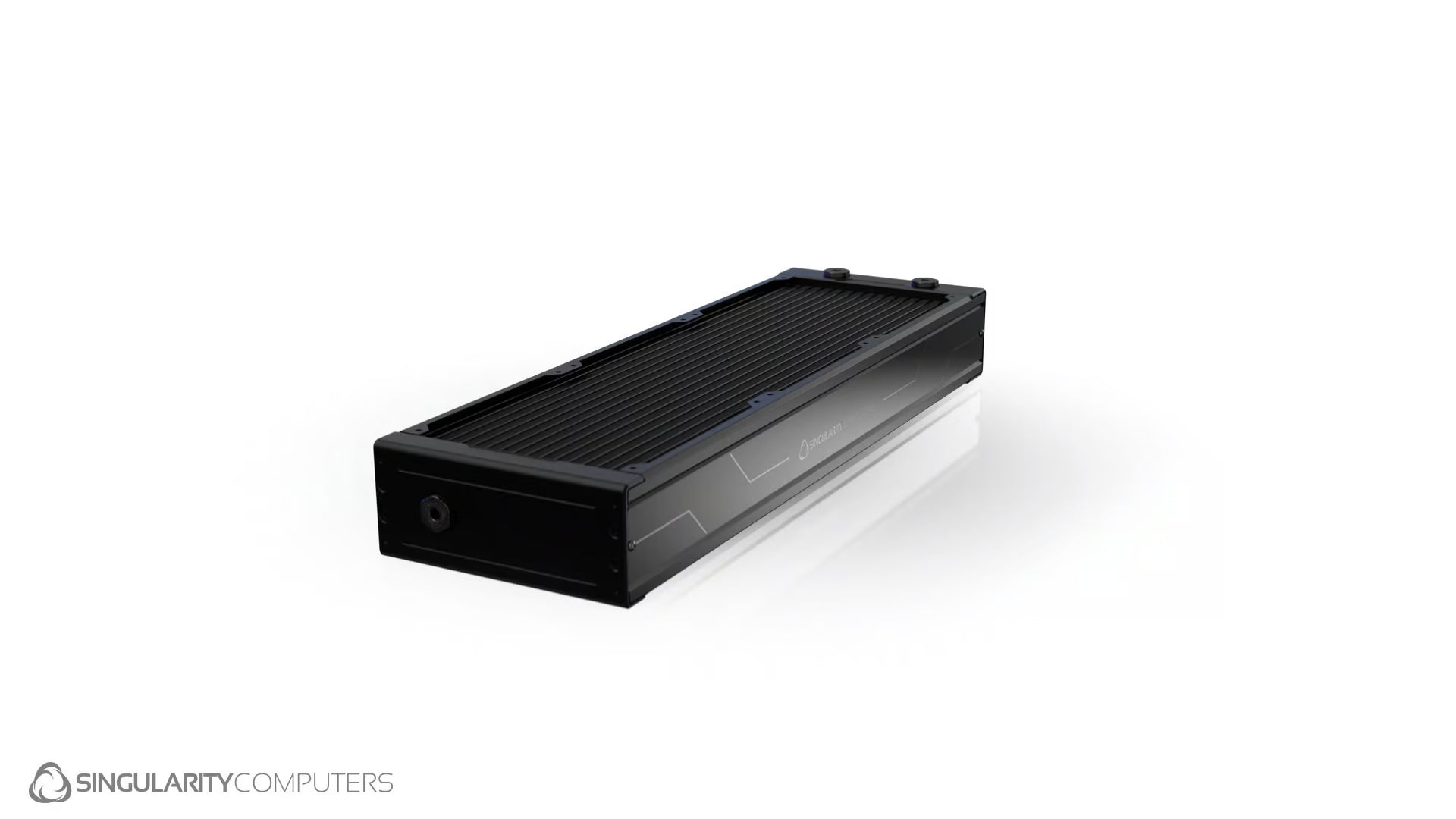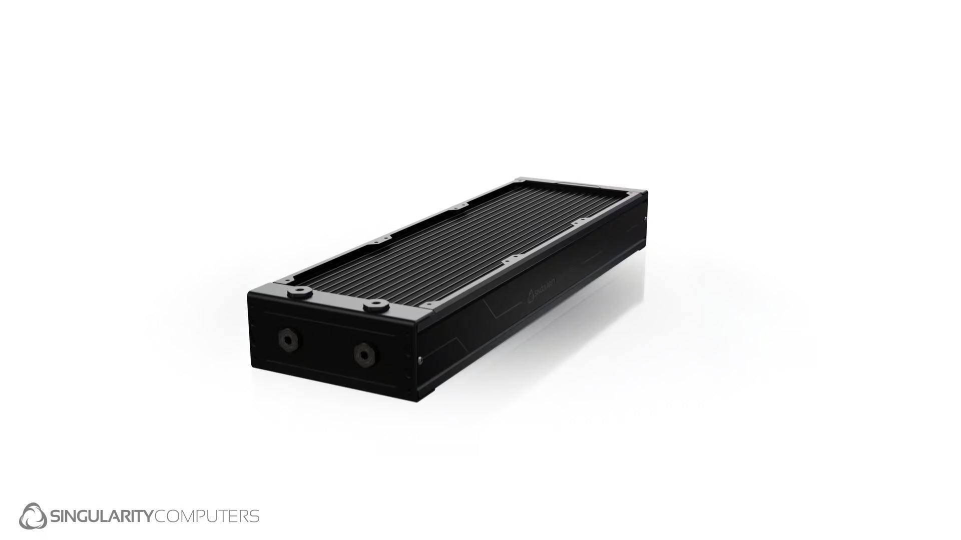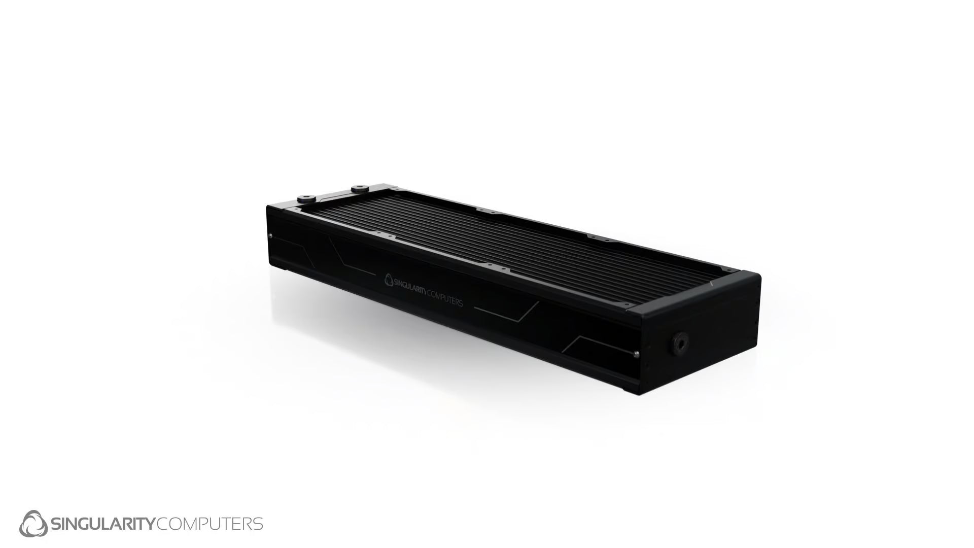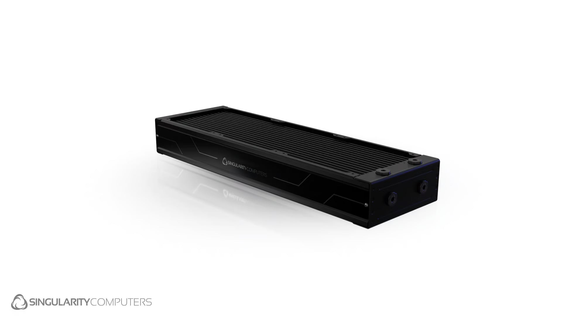 High performance, premium quality radiator with a full copper core. With 16 fins per inch the fin array is designed for low to medium RPM fans (800-1800rpm). Designed for maximum performance and low noise output with subtle industrial aesthetics. Satin Black powder coated finish. PCB covers on the sides with silver Singularity Computers Logos; these covers are removable. Multi-port design with two ports on one side, 2 ports on the end, and 1 port on the opposite end for 5 ports in total.
