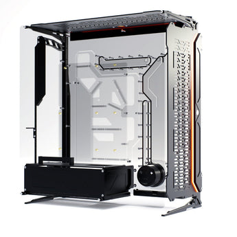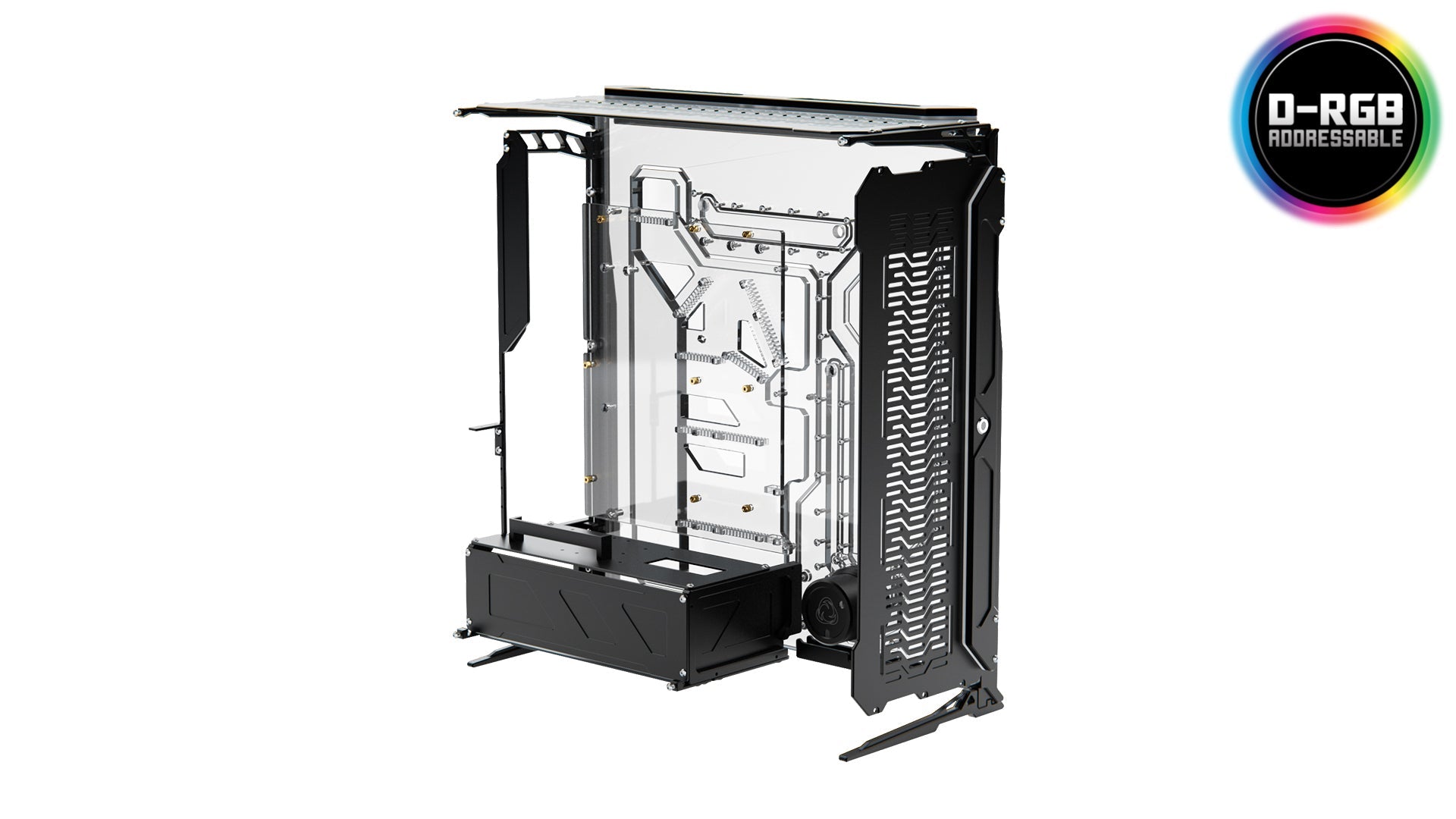 Every component of Spectre is CNC machined from a solid block of material. With the level of transparency and being an open case, we wanted it to be a celebration of the raw materials. There is no hidden or back side, and this also goes for the components being installed. Due to this we selected the most high-end materials and manufacturing processes. The Distribution Plate is machined on a CNC router built from thick sheets of cast acrylic. It is hand assembled with silicone gaskets and stainless-steel fasteners, and pressure tested. The metal components are machined with Extreme Precision from solid blocks of 6061 aluminum on a CNC mill then sand blasted and anodized.