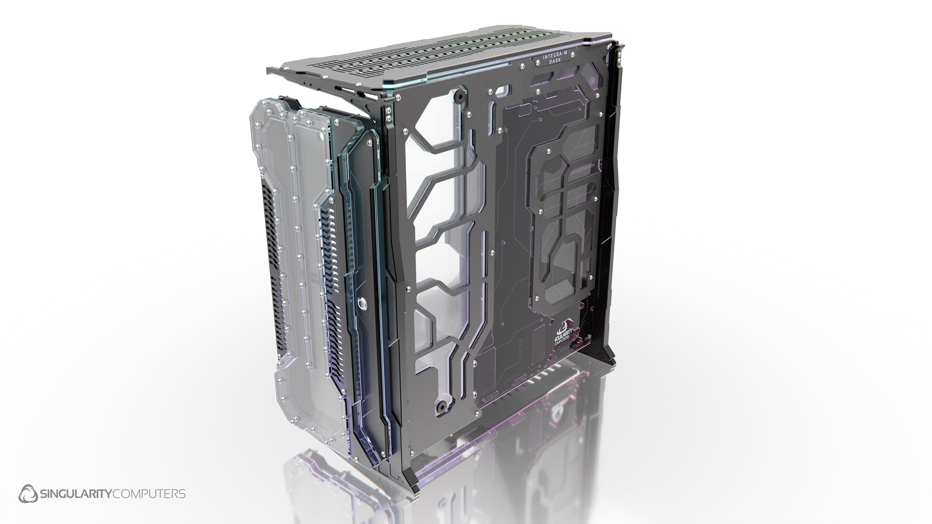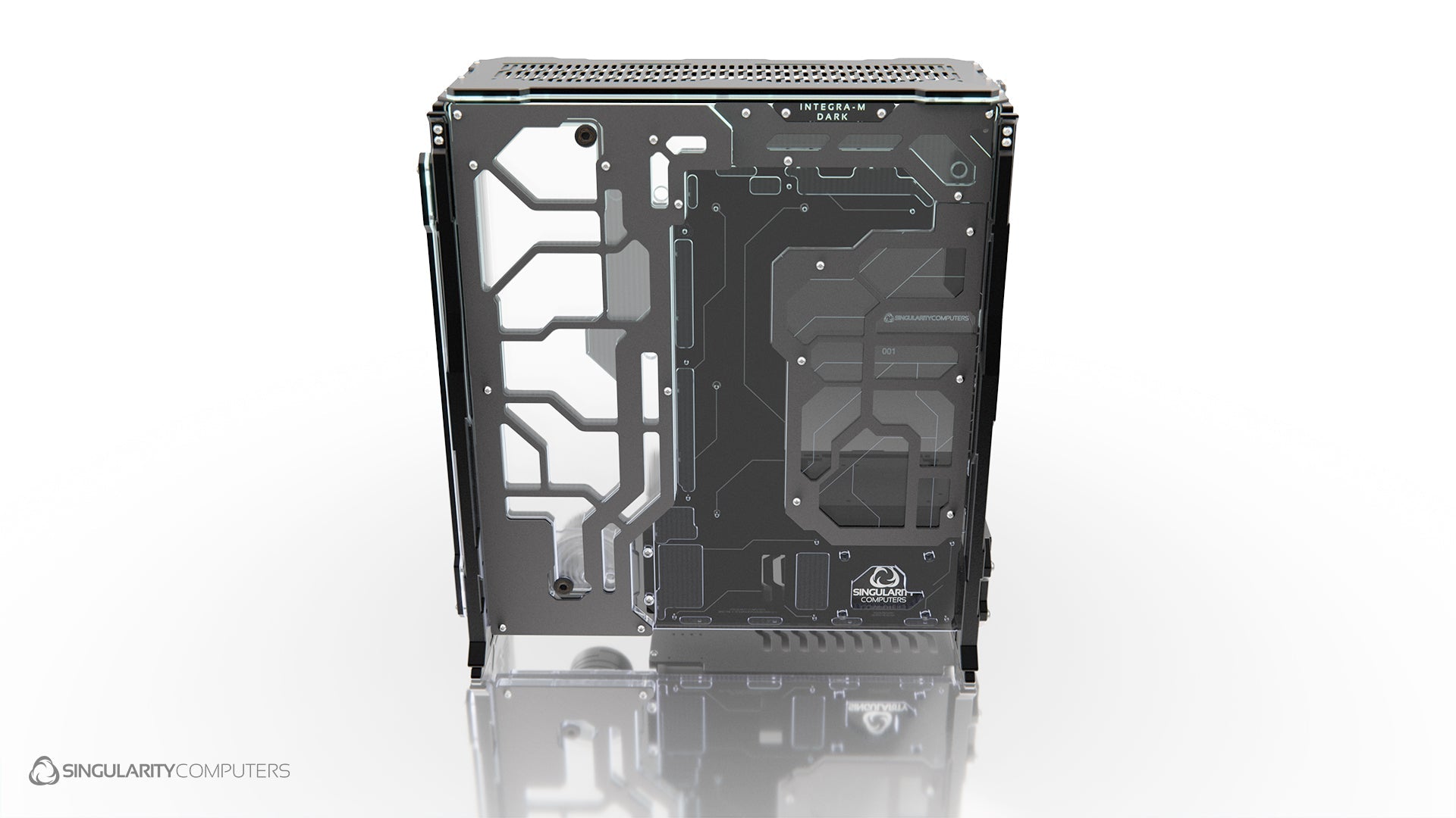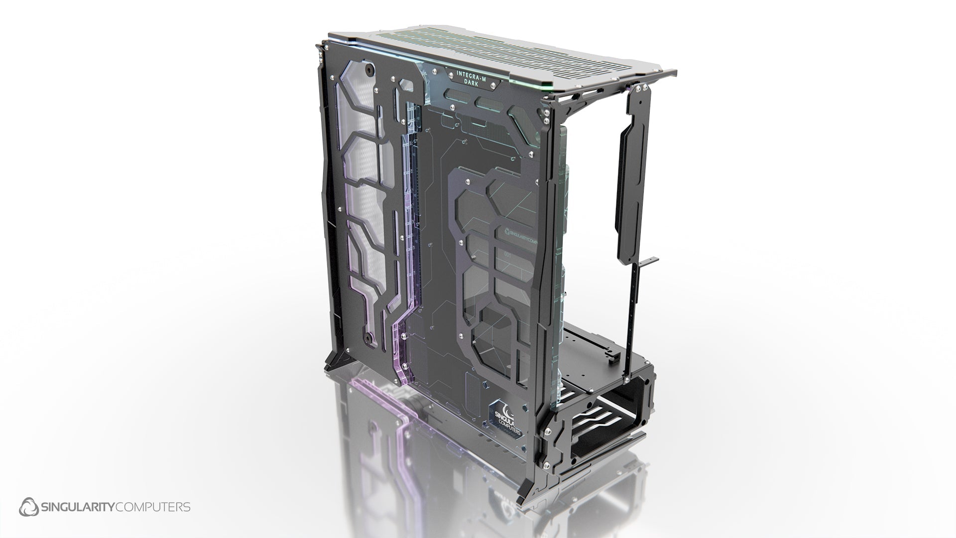 Spectre 3.0 Integra-M is a more compact ATX version of Spectre. It is a full re-design using everything we have learned from the development of Spectre which has continued since 2015. Integra-M is 25% smaller than Spectre 3.0 (all versions) but maintains all the features, except that it fits ATX motherboards and two 360mm radiators which are 40mm thick. Integra-M has a large part of the water-cooling loop integrated with a completely new distribution plate design. It has a fully integrated solution/replacement for cables with the Singularity Computers PowerBoard. Previously we have created PowerBoards for existing cases, but for Integra we have developed the PowerBoard and case together. This means that both have become far more streamlined, meaning more features and compatibility. The PowerBoard supports the most high-end components and includes two of the new 12VHPWR connectors. The PowerBoard has built in filter capacitors, 24 integrated ARGB and UV LEDs facing inwards and outwards, integrated direct connect SATA, power, and reset buttons, and a touch activated power button. There is no rear access needed to the case for cable management, all cables can be connected from the front and little to no cable management is needed. Black sleeved linking cables are included with the case. Custom colored sleeved linking cables can be purchased separately if desired.