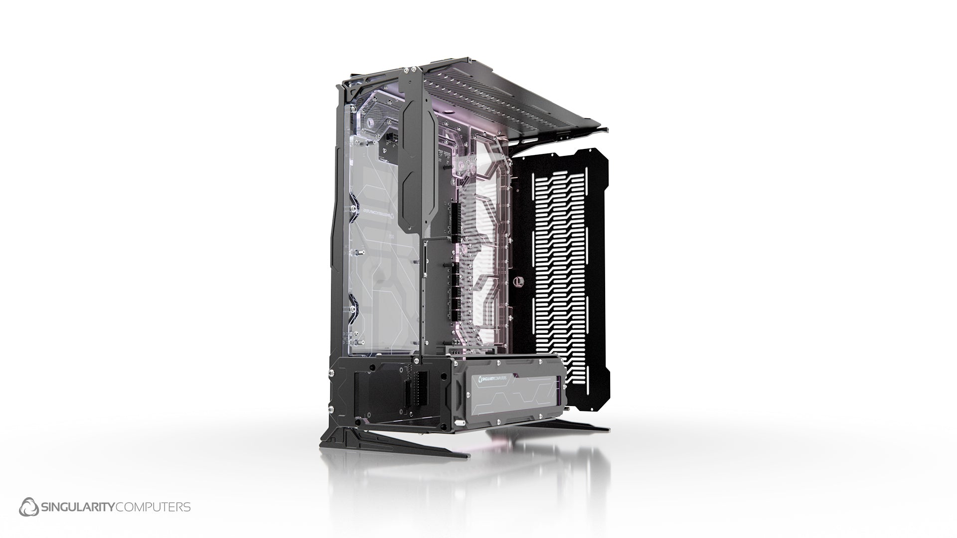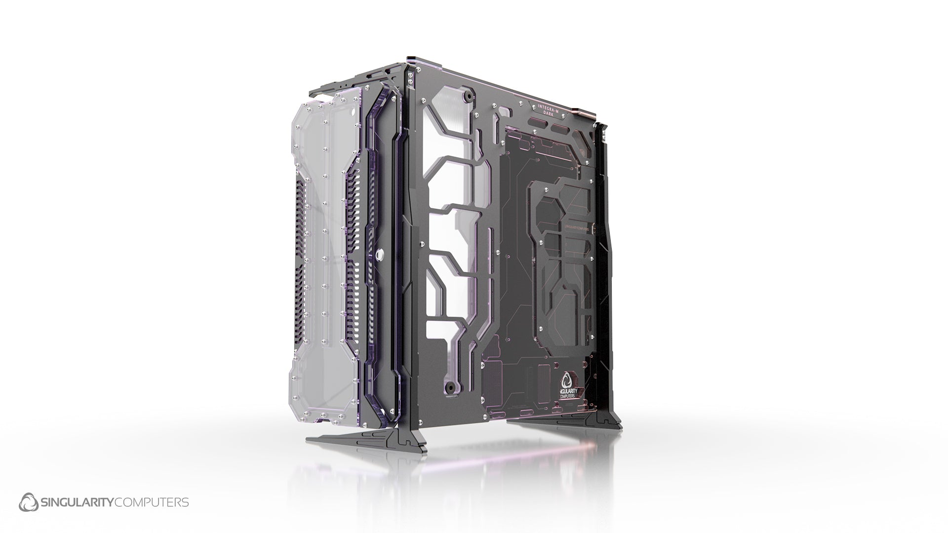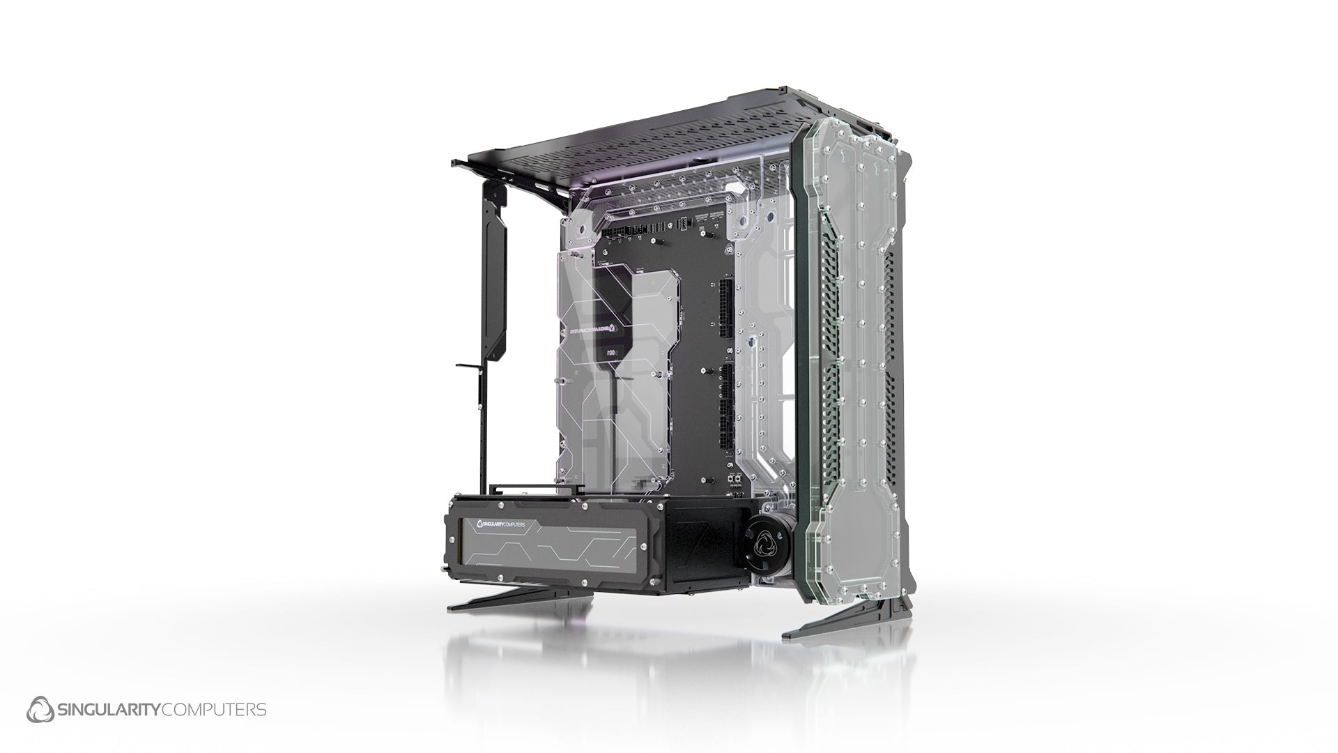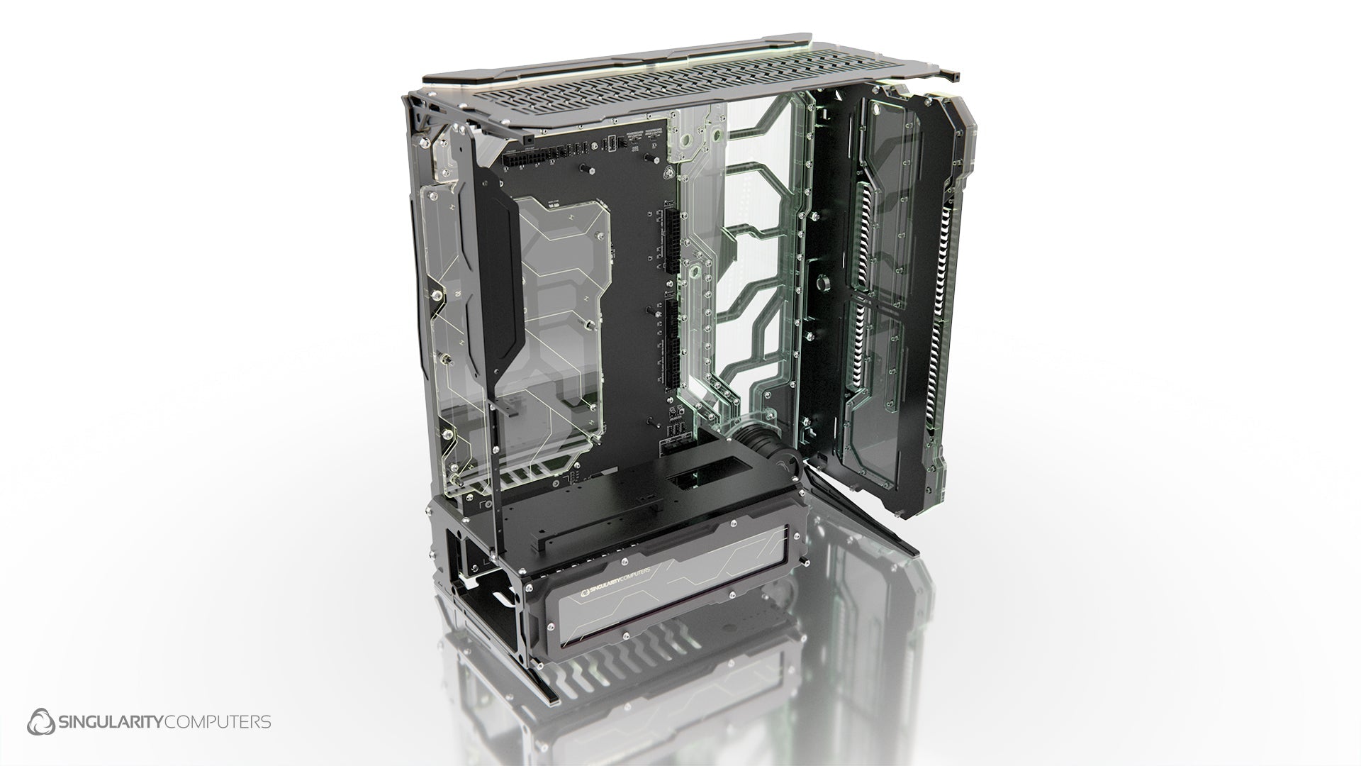 Spectre 3.0 Integra-M is a more compact ATX version of Spectre. It is a full re-design using everything we have learned from the development of Spectre which has continued since 2015. Integra-M is 25% smaller than Spectre 3.0 (all versions) but maintains all the features, except that it fits ATX motherboards and two 360mm radiators which are 40mm thick. Integra-M has a large part of the water-cooling loop integrated with a completely new distribution plate design. It has a fully integrated solution/replacement for cables with the Singularity Computers PowerBoard. Previously we have created PowerBoards for existing cases, but for Integra we have developed the PowerBoard and case together. This means that both have become far more streamlined, meaning more features and compatibility. The PowerBoard supports the most high-end components and includes two of the new 12VHPWR connectors. The PowerBoard has built in filter capacitors, 24 integrated ARGB and UV LEDs facing inwards and outwards, integrated direct connect SATA, power, and reset buttons, and a touch activated power button. There is no rear access needed to the case for cable management, all cables can be connected from the front and little to no cable management is needed. Black sleeved linking cables are included with the case. Custom colored sleeved linking cables can be purchased separately if desired.