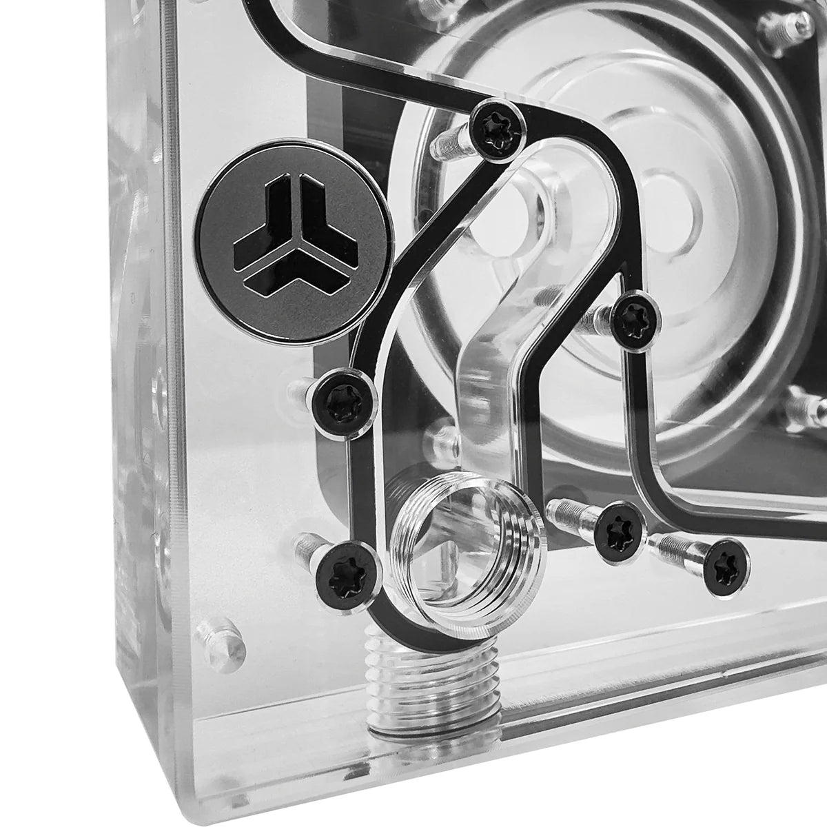 It supports both D5 and DDC pumps and offers a total of 5x G1/4" ports, providing flexible integration options for various water cooling setups.