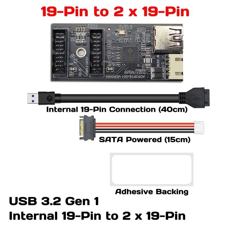 This Internal USB 3.2 Hub (compatible with USB 3.0 and USB 3.1) is the perfect remedy for a computer system lacking internal USB header/port space. This hub adds two USB ports (Internal 19-Pin Header or USB 3.2 Front Panel Header) to the computer by connecting to a USB header on the motherboard or to USB Type-A, and receives its power through the SATA power converter. Use this hub to add lighting, cooling or other systems that require additional USB space.