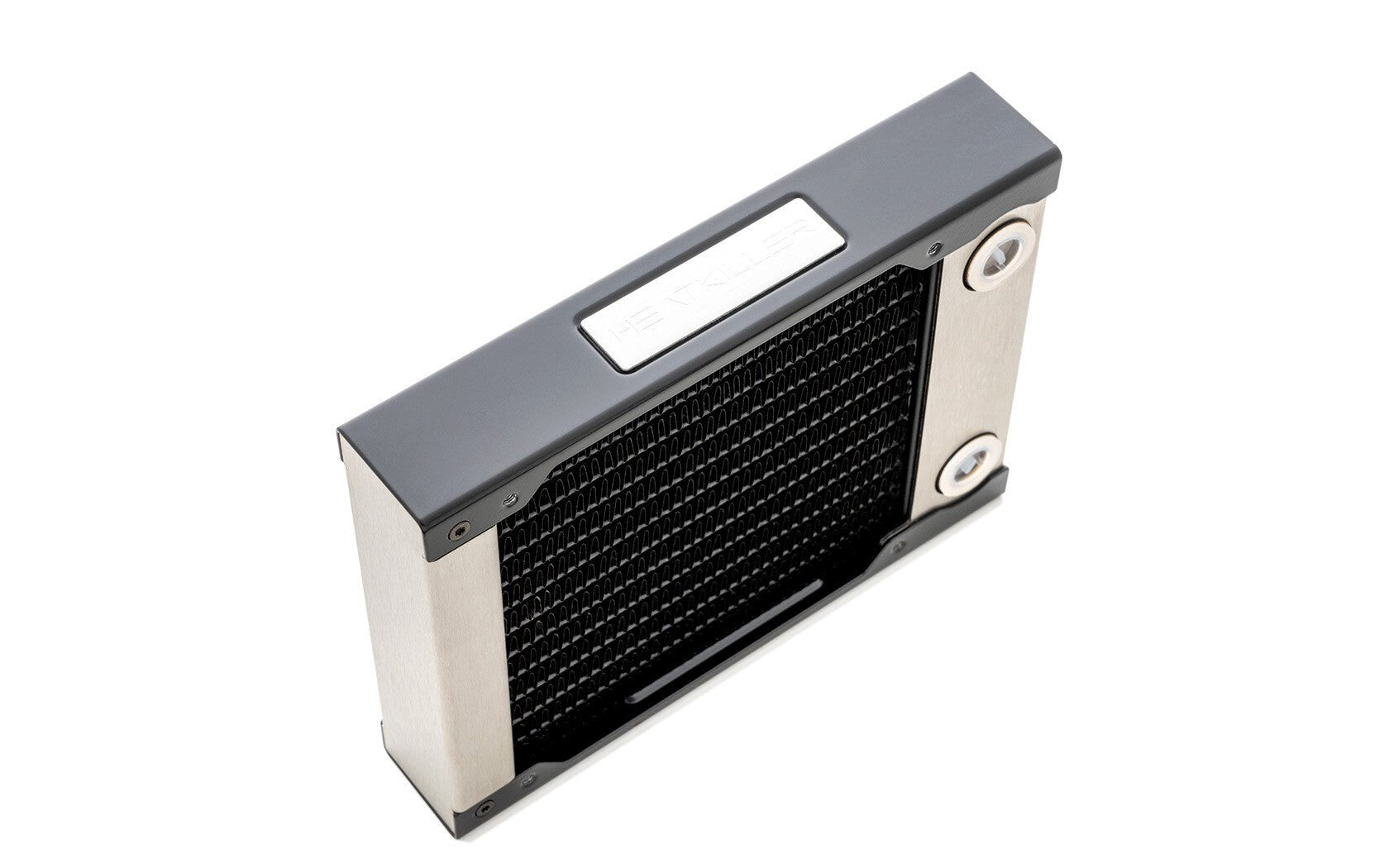 Only high quality raw materials are used as basis for the HEATKILLER RAD. The antechamber is made of brass while the cooling fins as well as the water channels are made of copper. The side panels are laser-cut from 1mm thick steel plates or stainless steel and subsequently brushed or powder-coated in black or white, depending on the finish.The front sides are made of brushed stainless steel and significantly contribute to the exclusive look of our HEATKILLER RAD.