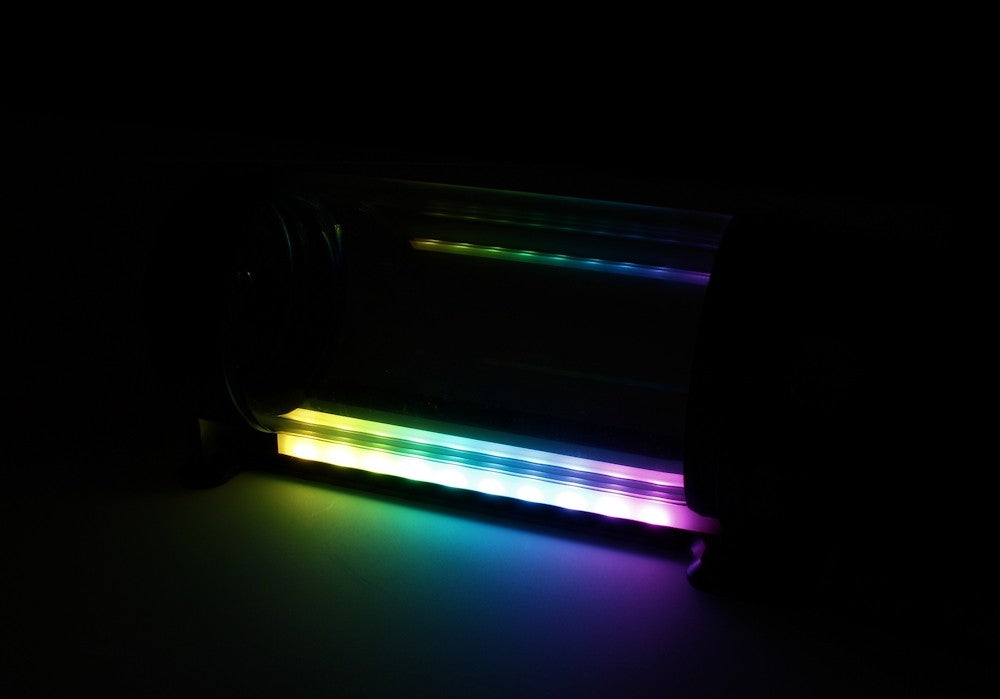 The tube is made from a high quality and ultra clear Acrylic, which when compared to a Glass Photon, you cannot tell the difference in clarity.. Both crystal clear and highly resistant to staining. The aRGB lighting is now at the back of the reservoir and features a diffuser strip for a more professional look to your build.